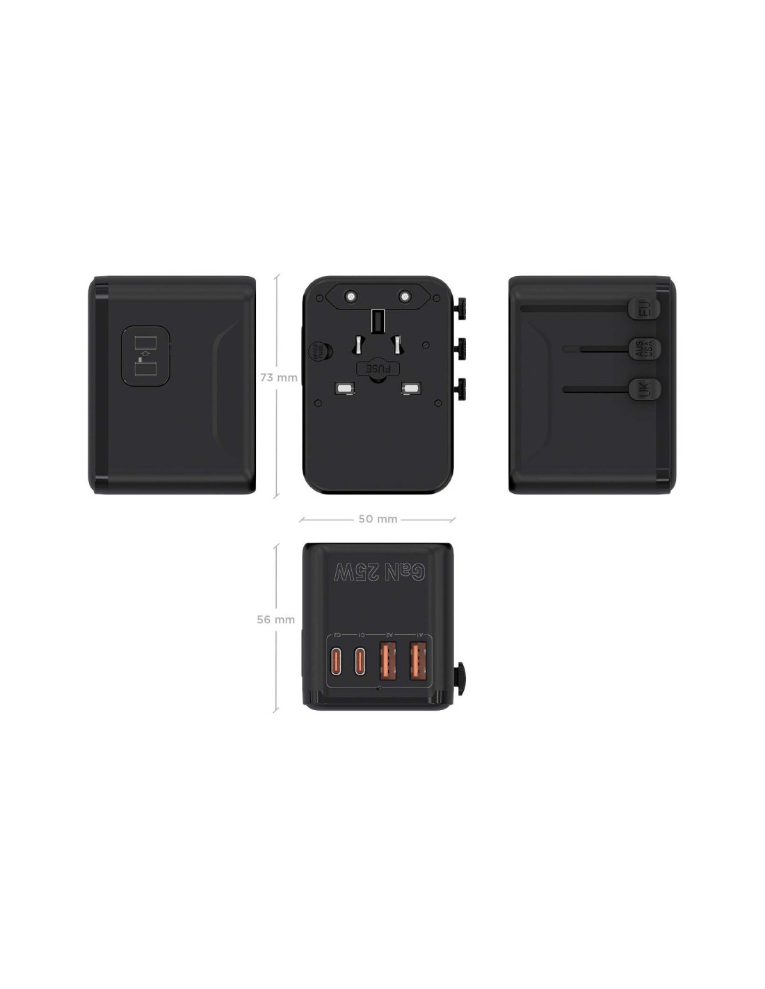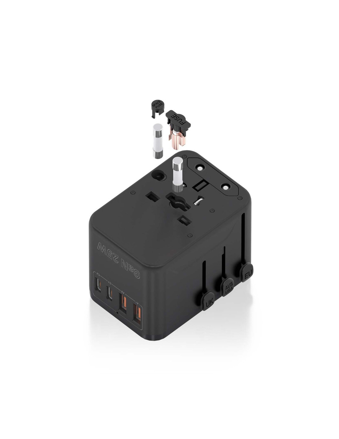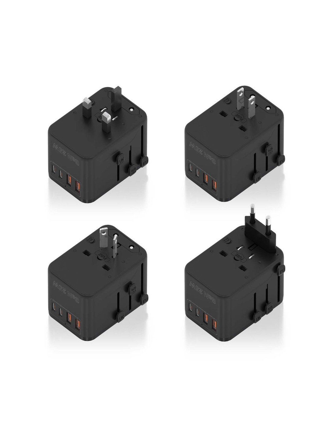- Cargador USB-C y USB-A GaN: Equipa 2 puertos USB-A (18W) y 2 puertos USB-C (25W) para cargar hasta 4 dispositivos simultáneamente.