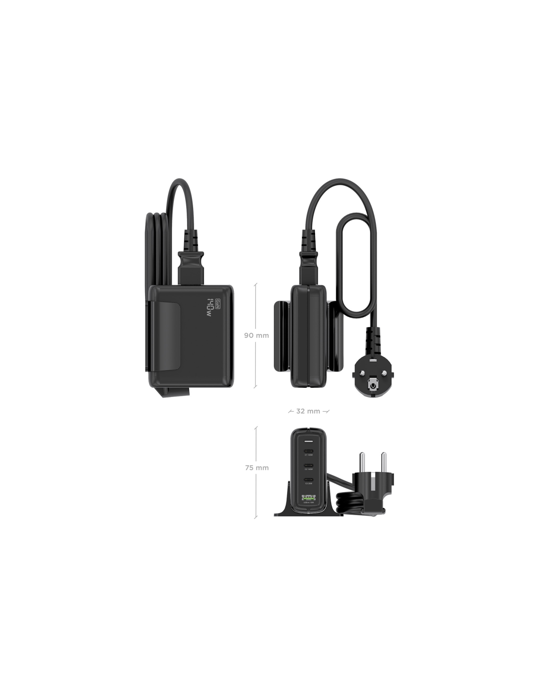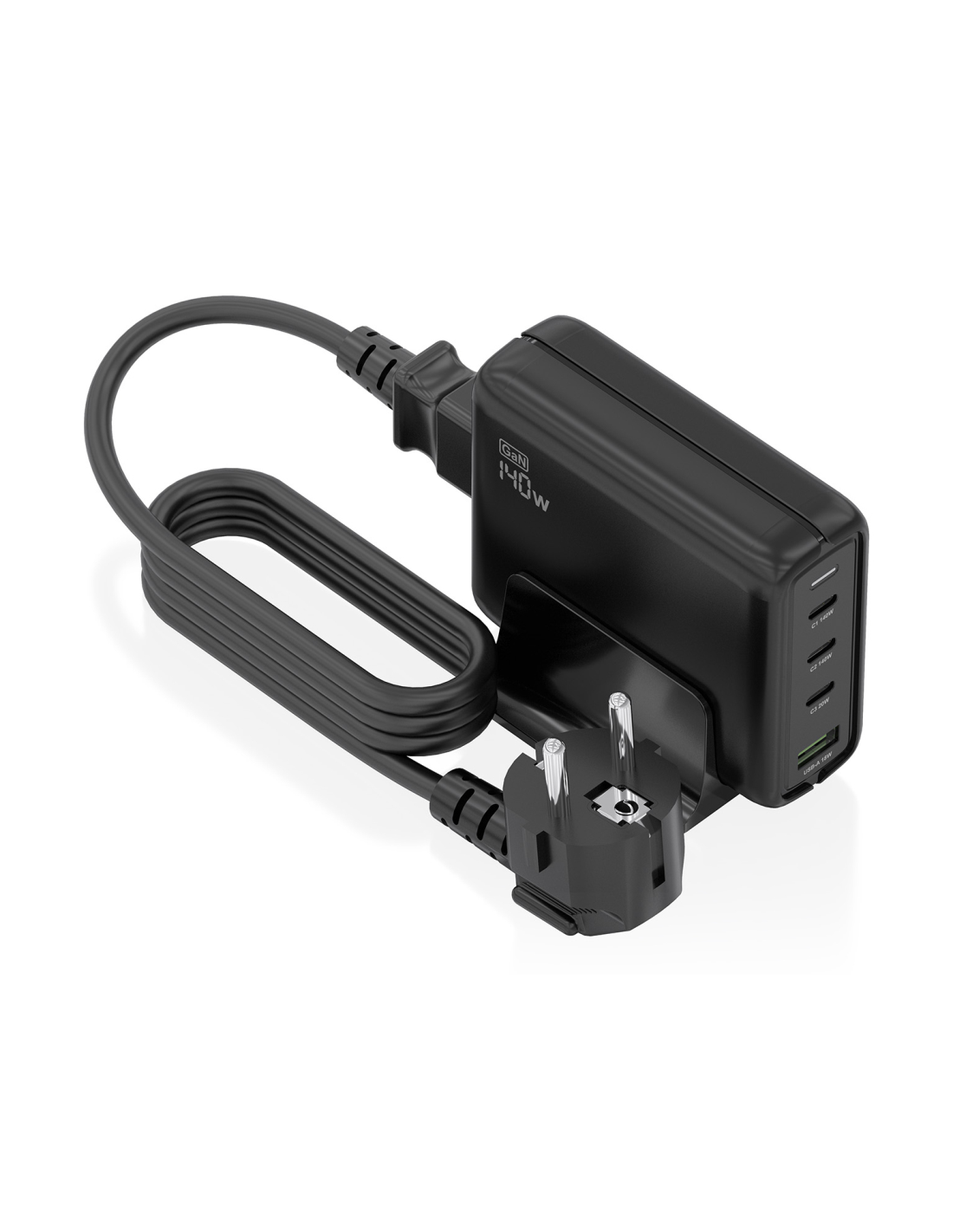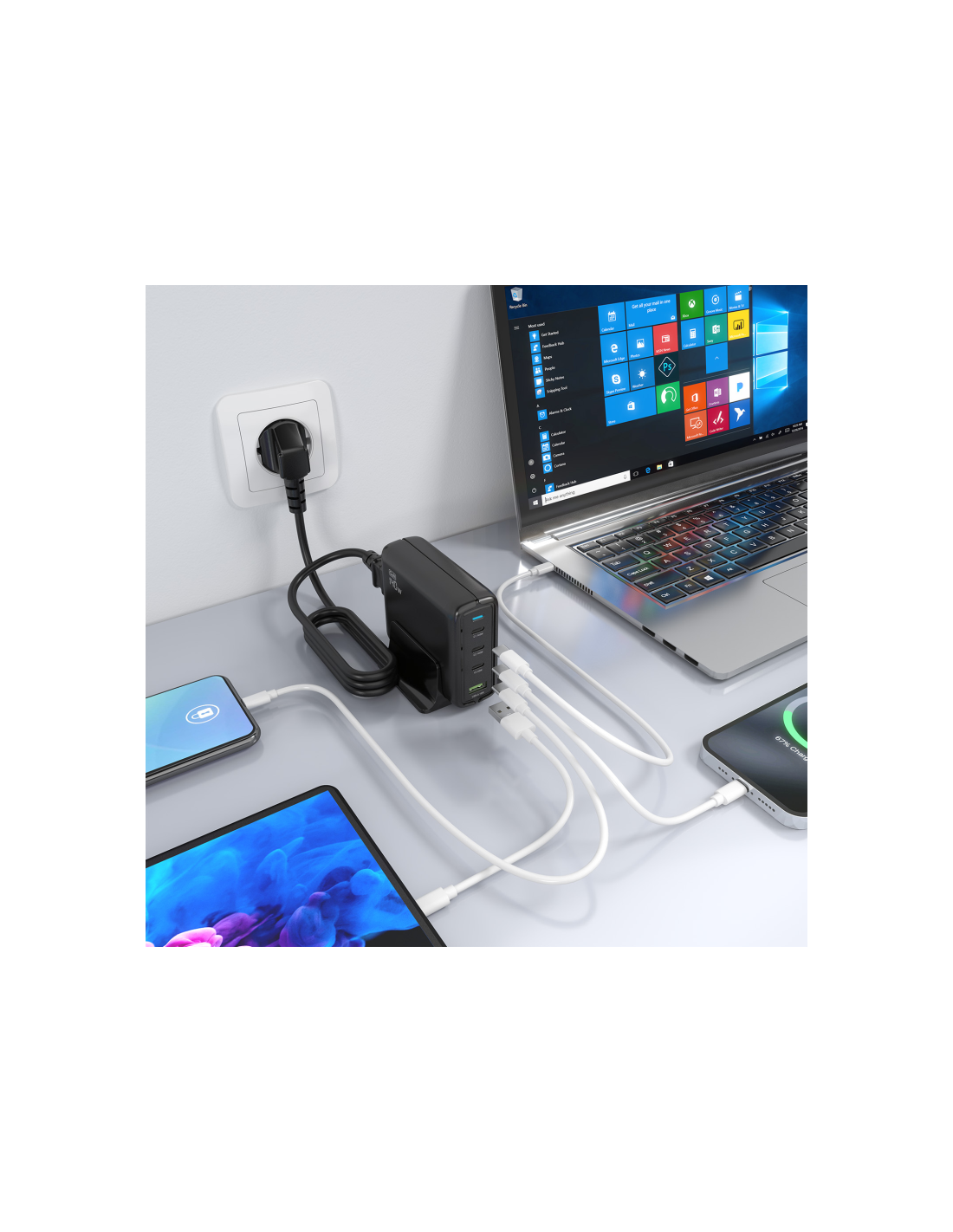 > Cargador de sobremesa GaN USB-C PD3.1 de 140W. Carga rápidamente portátiles, móviles, tablets, cámaras u otros dispositivos. Su diseño de sobremesa ofrece un acceso cómodo y rápido a los puertos USB.
