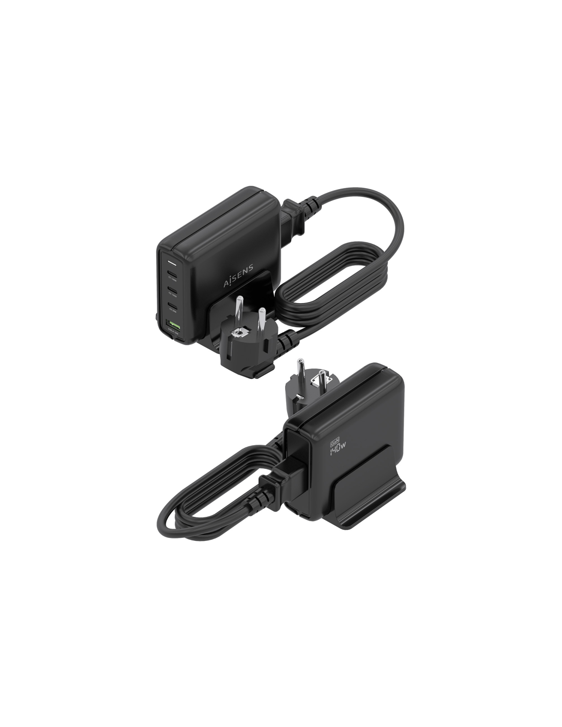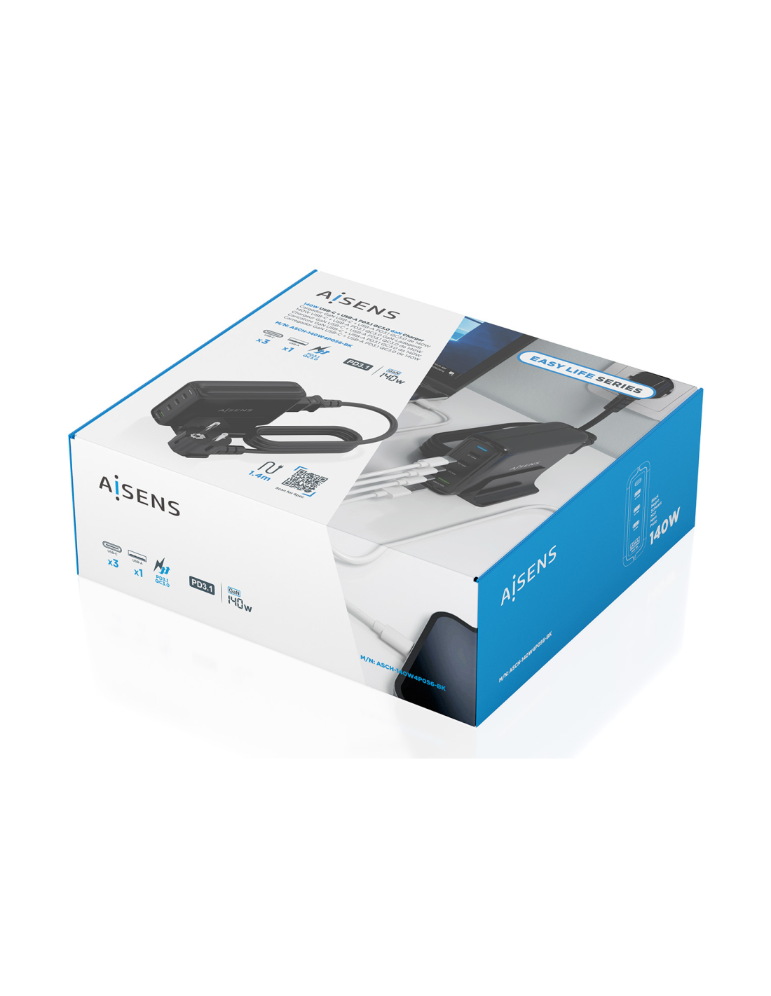 AISENS Cargador Sobremesa GaN 140W, 3x USB-C PD3.1 QC4.0 QC5.0, 1x USB-A QC3.0, Negro. Tipo de cargador: Interior, Alimentación: Corriente alterna, Compatibilidad del cargador: Universal. Voltaje de entrada: 100 - 240 V, Voltaje de salida máximo: 20 V, Corriente de salida de adaptador AC: 5 A. Cantidad de puertos USB 2.0: 1, Número de puertos USB Tipo C: 3, Carga rápida, Funciones de protección de poder: Sobrecarga, Sobrecarga, Cortocircuito. Longitud de cable: 1,4 m, Color del producto: Negro