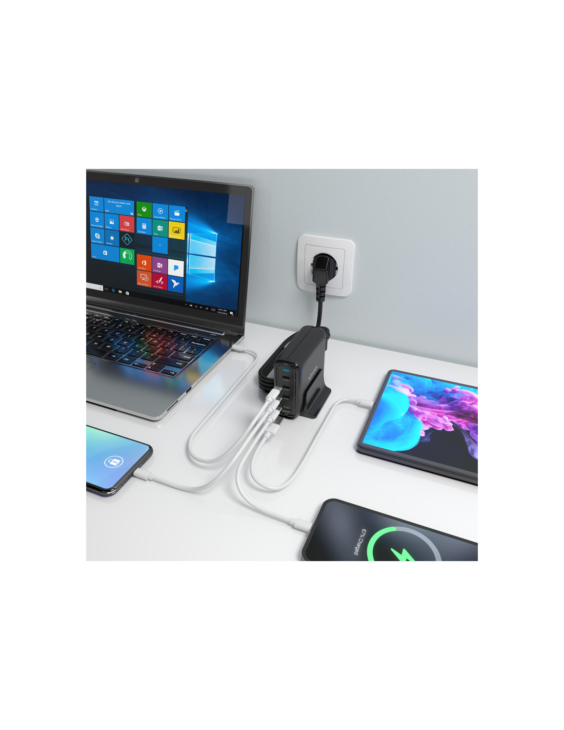 > Este cargador puede cargar simultáneamente 4 dispositivos USB-A y USB-C a máxima velocidad.
