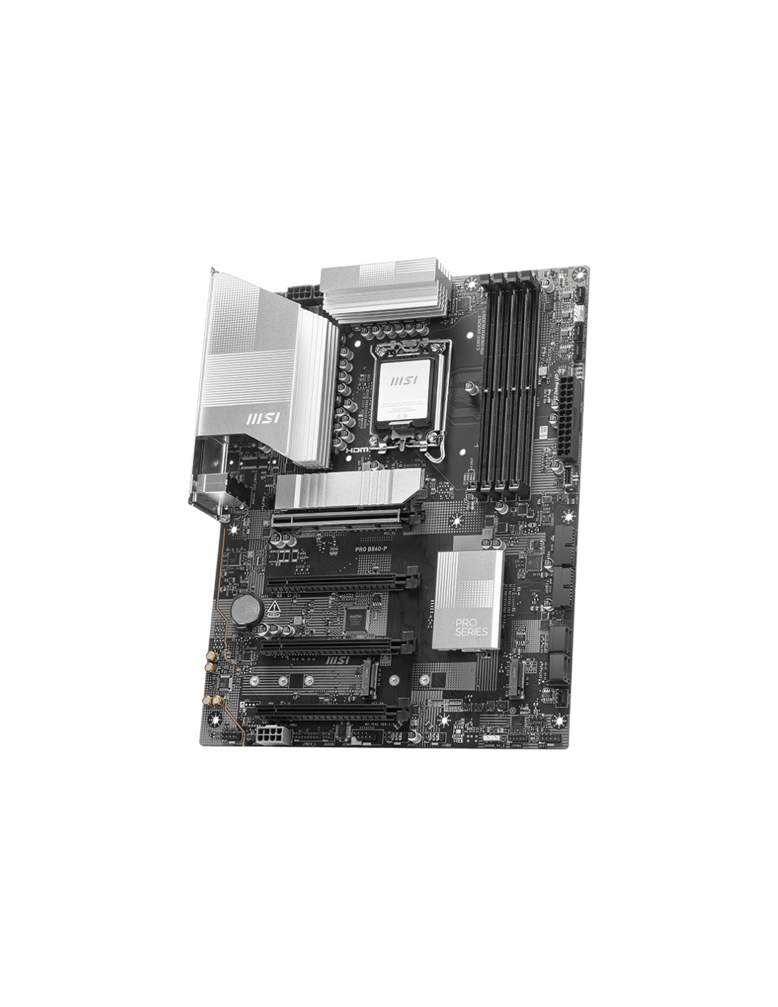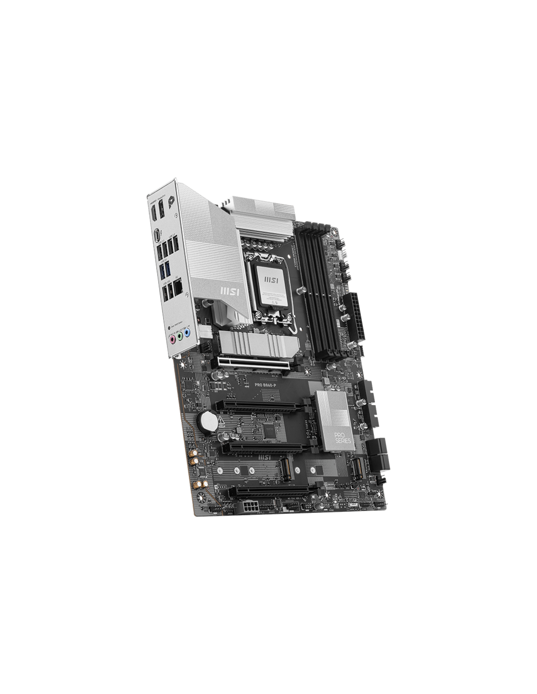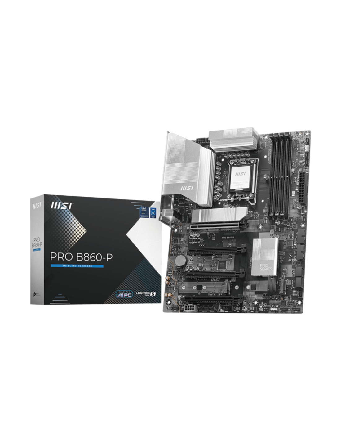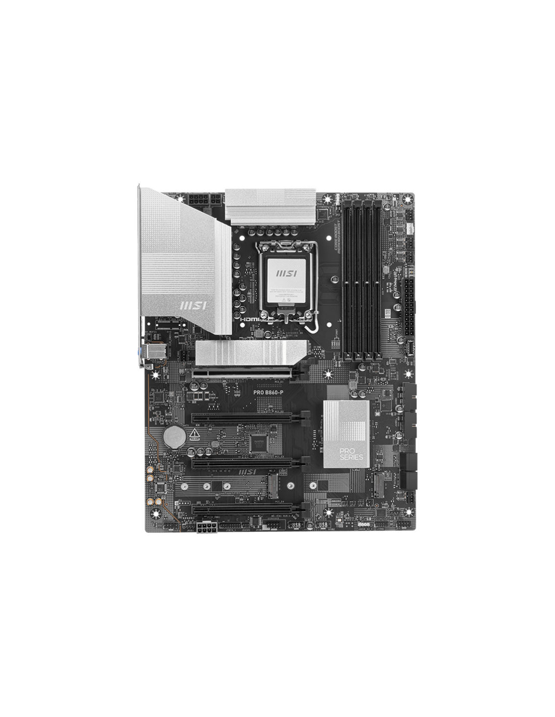 MSI PRO B860-P. Fabricante de procesador: Intel, Socket de procesador: LGA 1851 (Socket V1), Procesador compatible: Intel Core Ultra (Series 2). tipos de memoria compatibles: DDR5-SDRAM, Memoria interna máxima: 256 GB, Tipo de ranuras de memoria: DIMM. Interfaces de disco de almacenamiento soportados: M.2, Micro SATA III, Tipos de unidades de almacenamiento admitidas: HDD & SSD, Niveles RAID: 0, 1, 5, 10. Tipo de interfaz ethernet: 5 Gigabit Ethernet. Componente para: PC, Factor de forma: ATX, Familia del c
