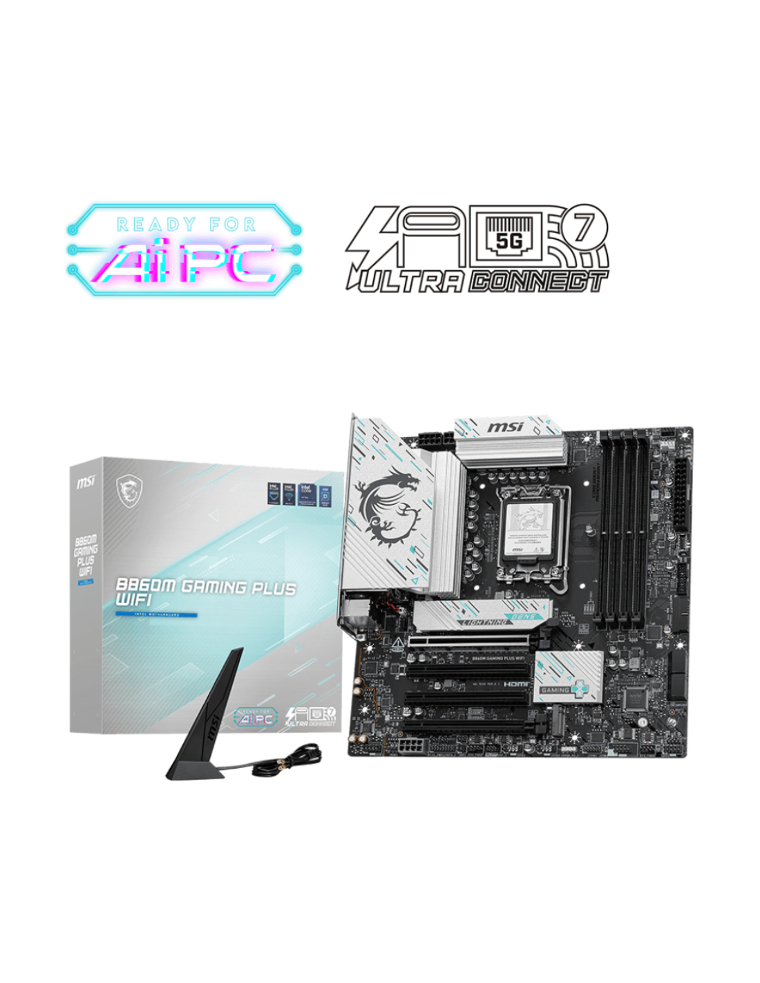 MSI B860M GAMING PLUS WIFI. Fabricante de procesador: Intel, Socket de procesador: LGA 1851 (Socket V1), Procesador compatible: Intel Core Ultra (Series 2). tipos de memoria compatibles: DDR5-SDRAM, Memoria interna máxima: 256 GB, Tipo de ranuras de memoria: DIMM. Interfaces de disco de almacenamiento soportados: M.2, Micro SATA III, Tipos de unidades de almacenamiento admitidas: HDD & SSD, Niveles RAID: 0, 1, 5, 10. Tipo de interfaz ethernet: 5 Gigabit Ethernet, Estándar Wi-Fi: Wi-Fi 7 (802.11be), Wi-Fi es