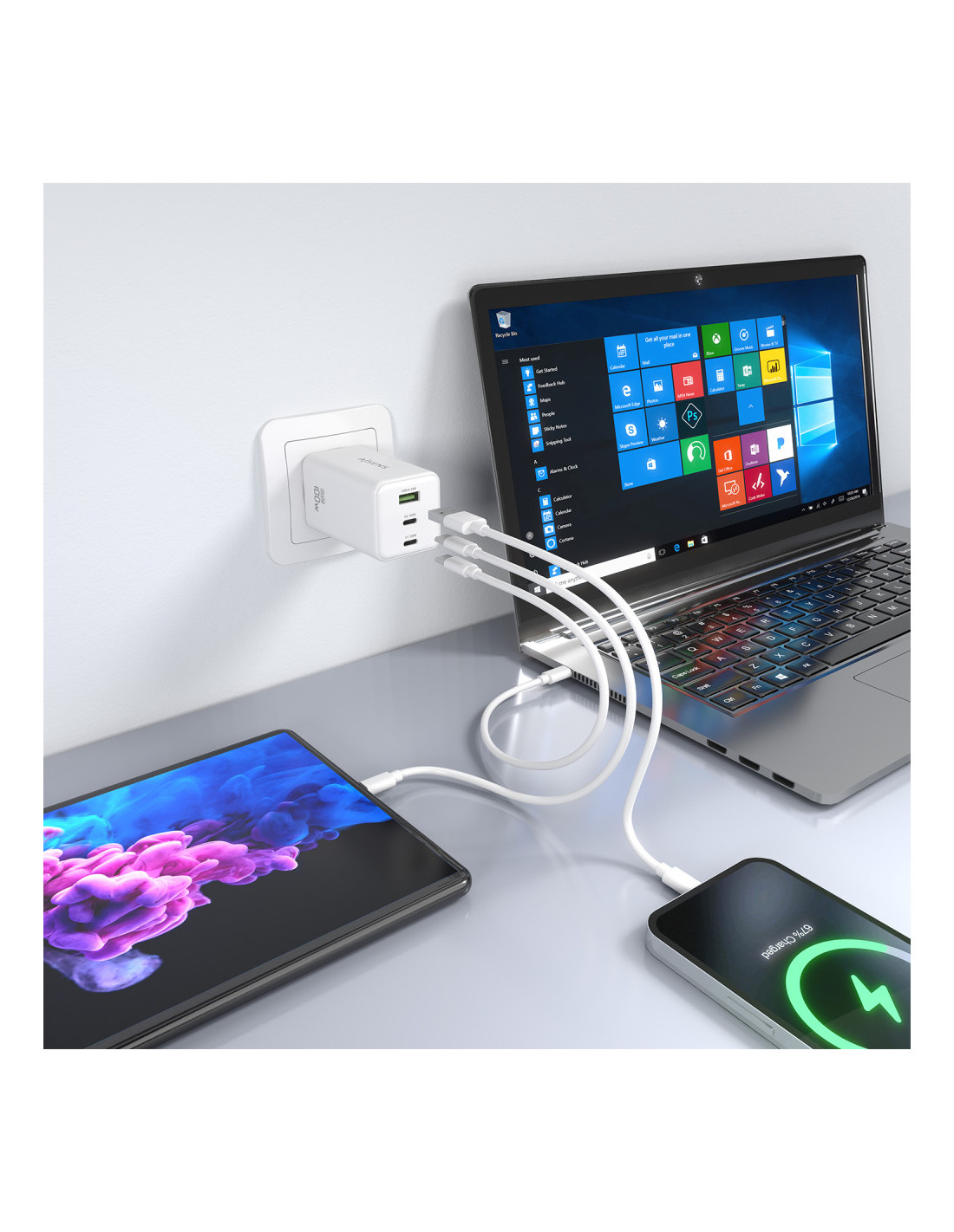 > Este cargador puede cargar simultáneamente 3 dispositivos USB-A y USB-C a máxima velocidad.