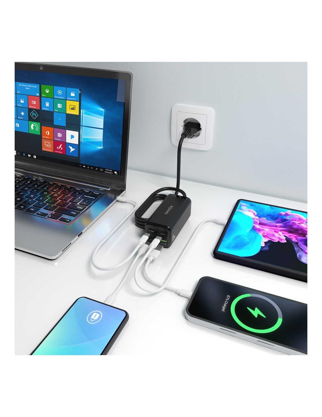 > Cargador de sobremesa GaN USB-C de 100W. Carga rápidamente portátiles, móviles, tablets, cámaras u otros dispositivos. Su diseño de sobremesa ofrece un acceso cómodo y rápido a los puertos USB.