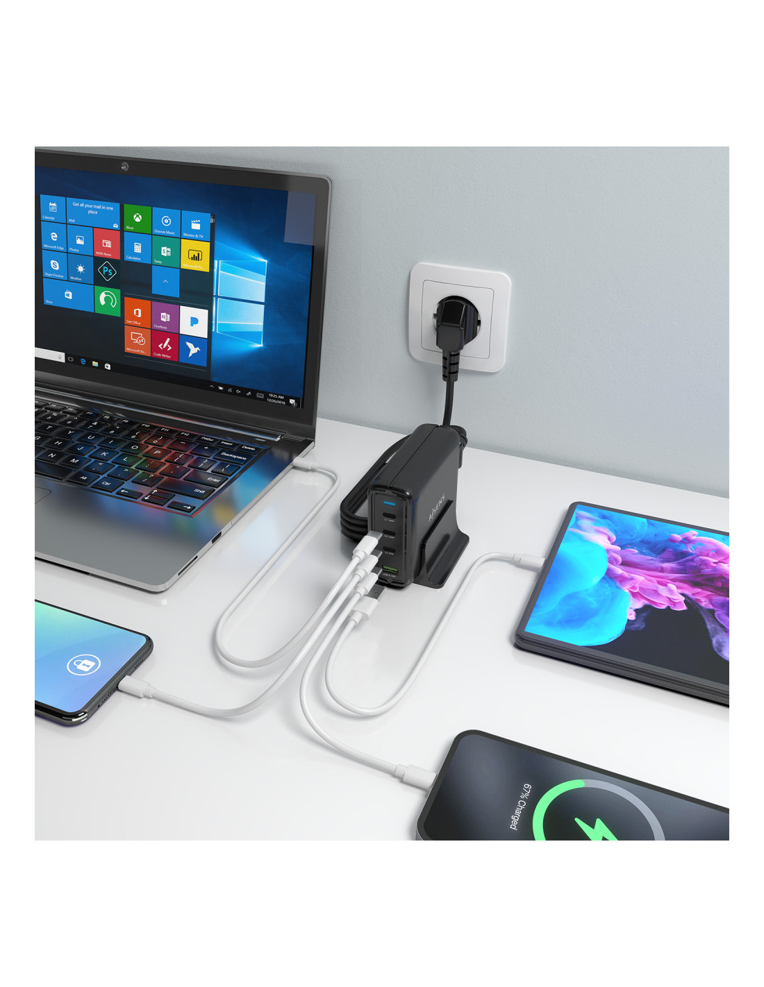 > Este cargador puede cargar simultáneamente 4 dispositivos USB-A y USB-C a máxima velocidad.