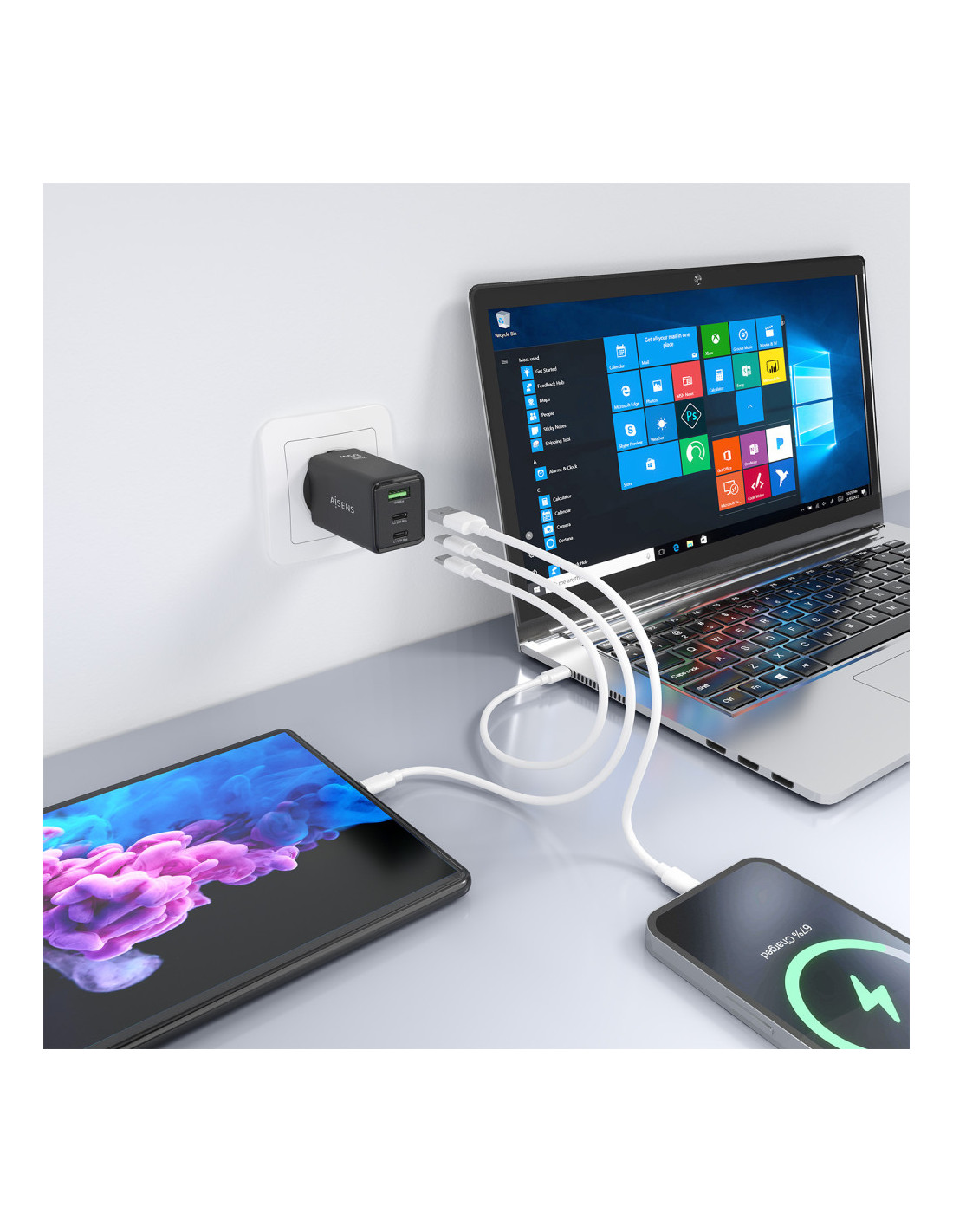 > Este cargador puede cargar simultáneamente 3 dispositivos USB-A y USB-C a máxima velocidad.