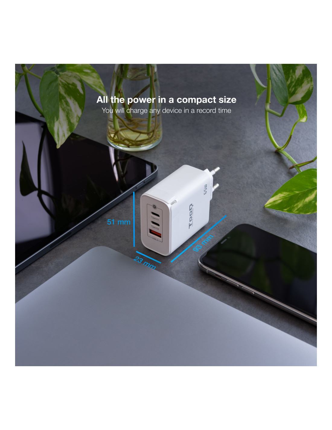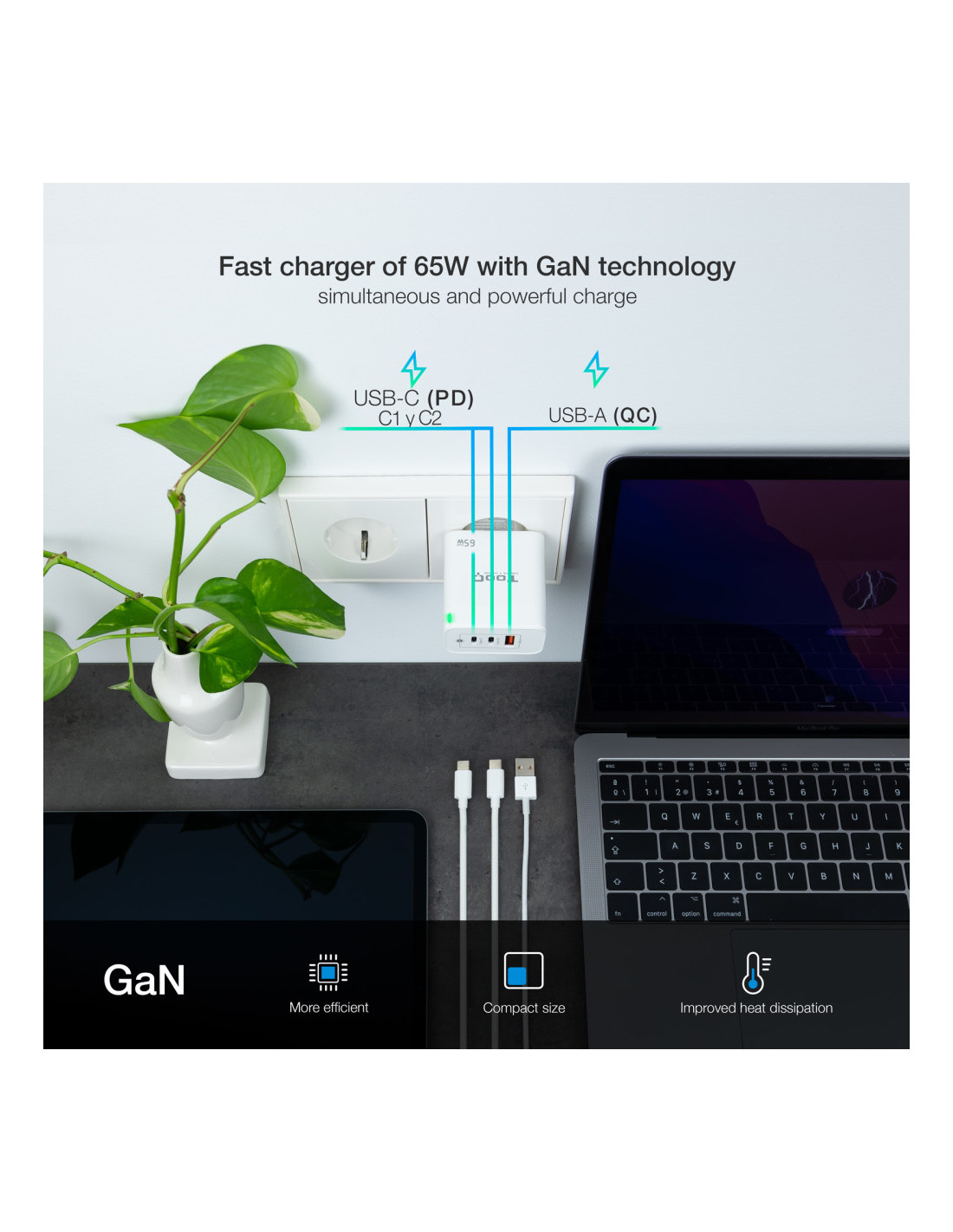 ¡Pequeño y rápido! La fabricación con GaN (Nitruro de Galio), permite un suministro de corriente más eficiente disminuyendo las altas temperaturas que soportan los dispositivos. ¿A qué esperas para hacerte con él?