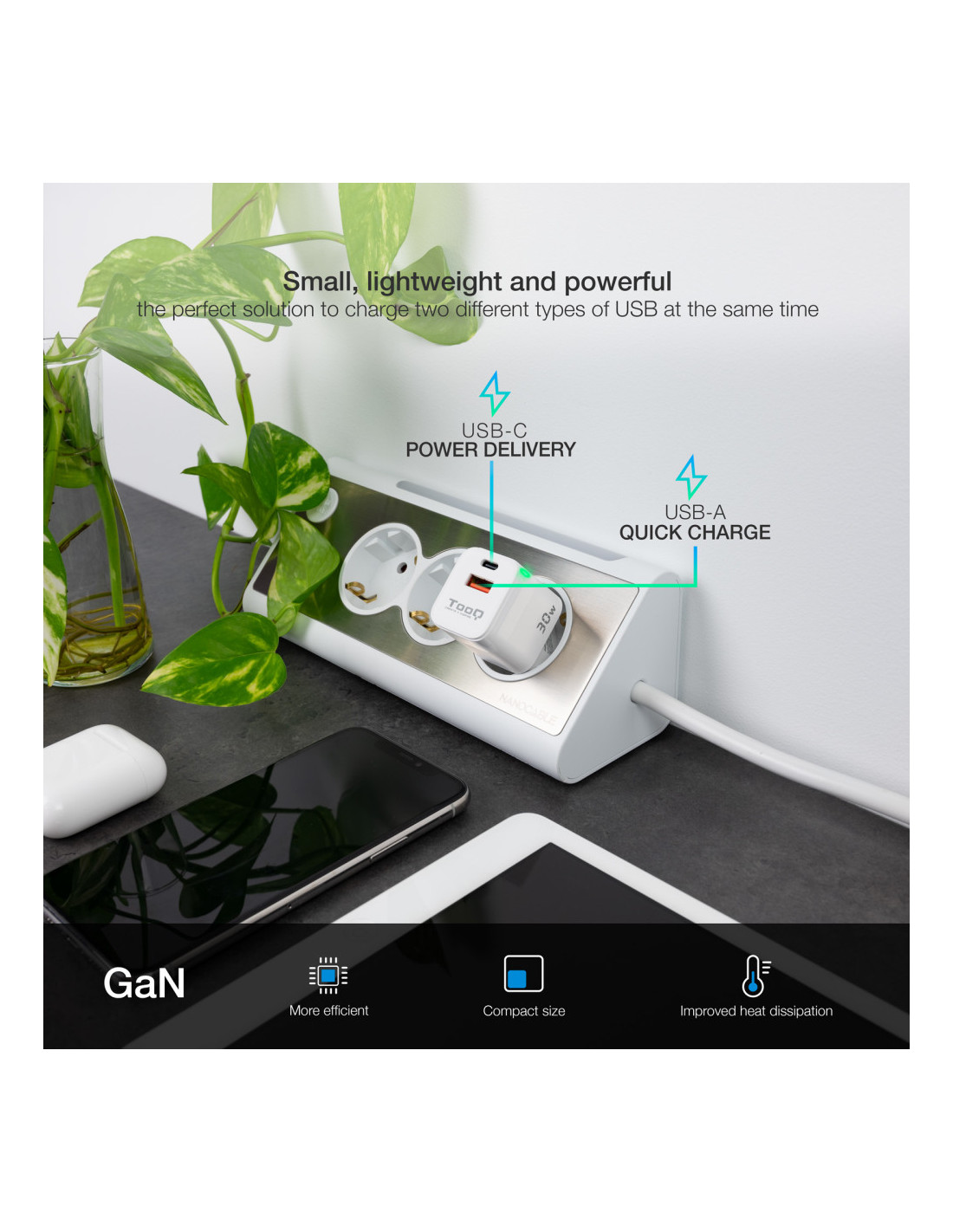 ¡Pequeño y rápido! La fabricación con GaN (Nitruro de Galio), permite un suministro de corriente más eficiente disminuyendo las altas temperaturas que soportan los dispositivos. ¿A qué esperas para hacerte con él?