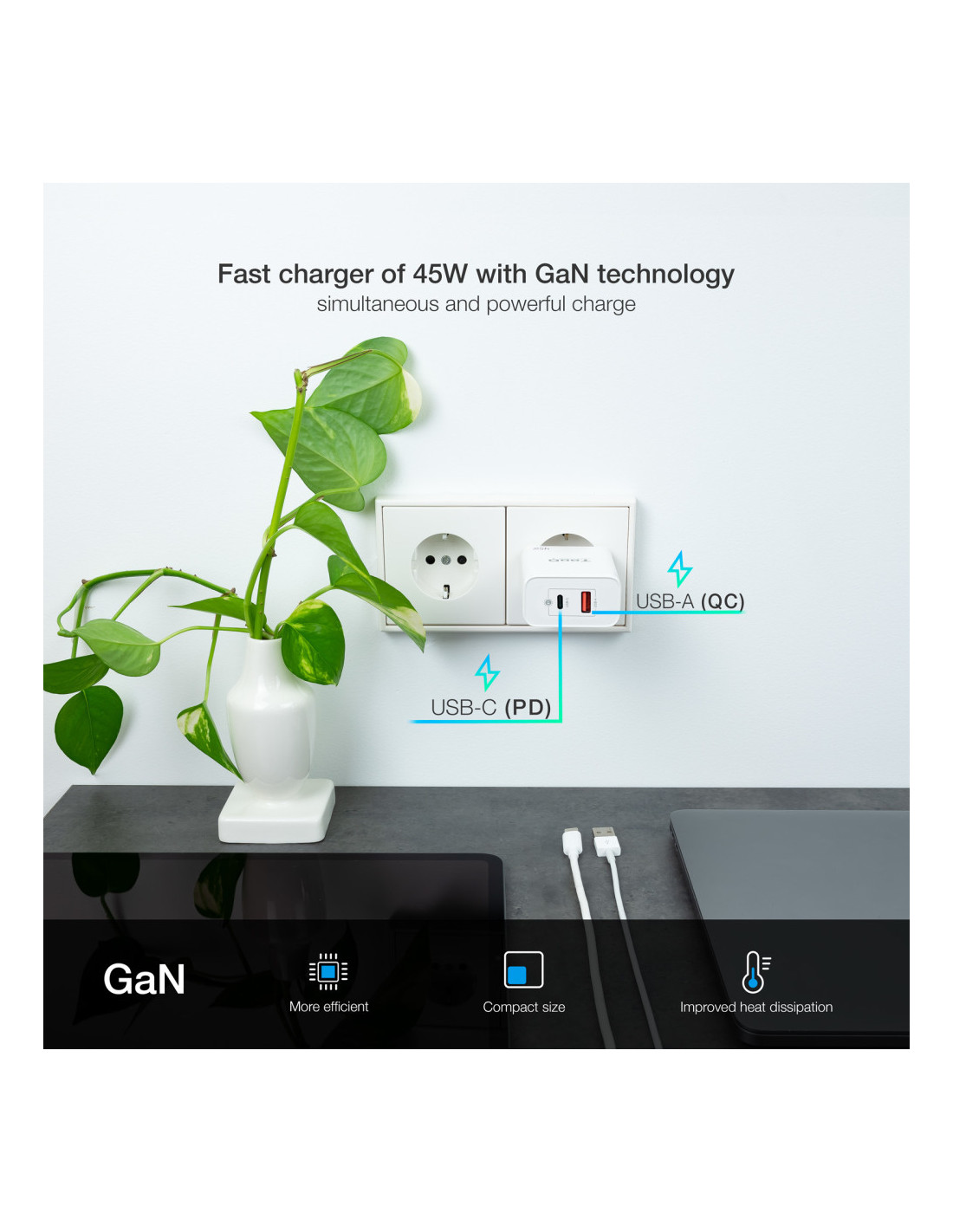 ¡Pequeño y rápido! La fabricación con GaN (Nitruro de Galio), permite un suministro de corriente más eficiente disminuyendo las altas temperaturas que soportan los dispositivos. ¿A qué esperas para hacerte con él?