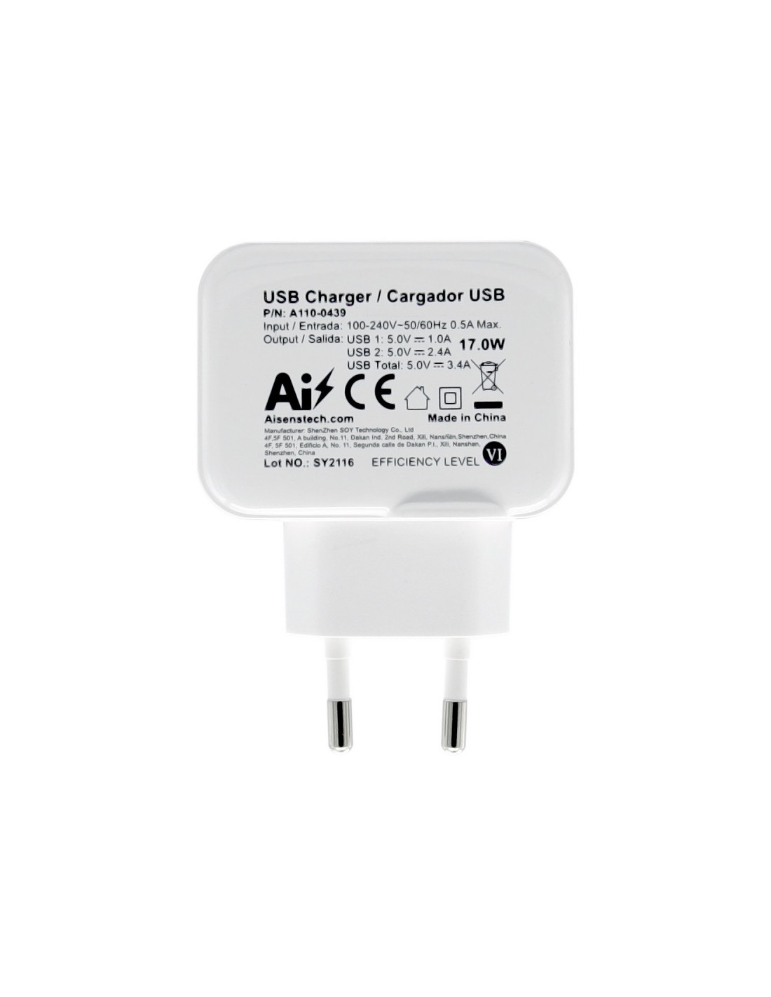 Gracias a la salida de 17W 3,4A, este cargador de pared puede cargar simultáneamente dos dispositivos USB a máxima velocidad (hasta 2,4A/Puerto USB).