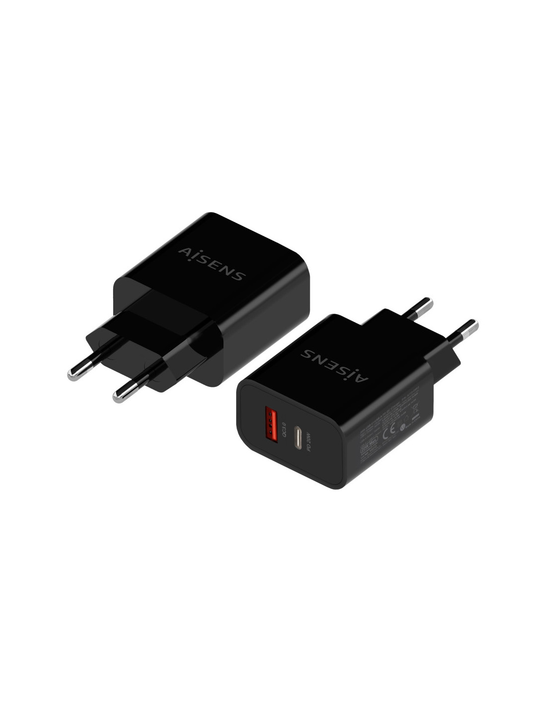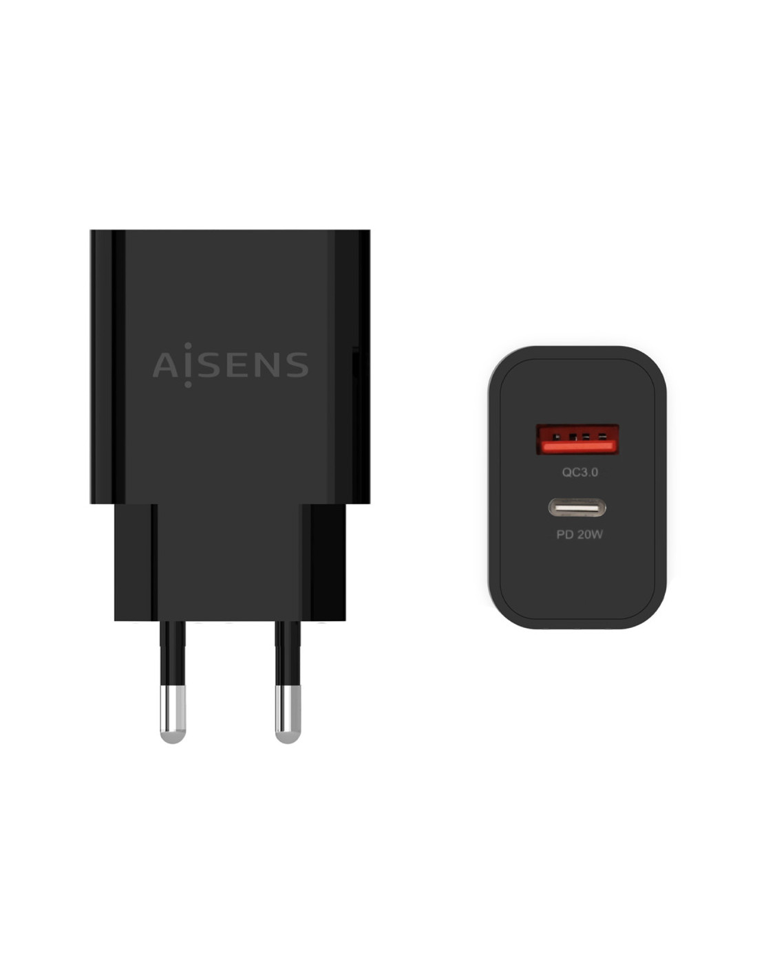 AISENS® – Cargador 20W, 1xUSB-C PD3.0, 1xUSB-A QC3.0, Negro