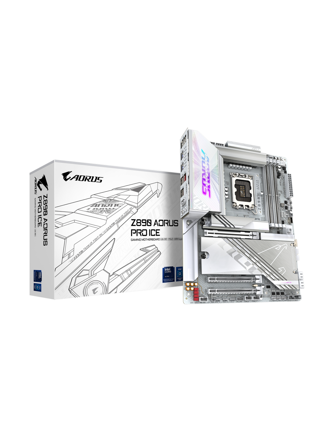 GIGABYTE Placa base Z890 AORUS PRO ICE - Compatible con CPUs Intel Core Ultra (Serie 2), VRM de 16+1+2 fases, hasta 9500MHz DDR5 (OC), 1xPCIe 5.0 + 4xPCIe 4.0, Wi-Fi 7, LAN 5GbE, Thunderbolt 4. Fabricante de procesador: Intel, Socket de procesador: LGA 1851 (Socket V1), Procesador compatible: Intel Core Ultra (Series 2). tipos de memoria compatibles: DDR5-SDRAM, Memoria interna máxima: 256 GB, Tipo de ranuras de memoria: DIMM. Interfaces de disco de almacenamiento soportados: M.2, SATA III, Tipos de unidade