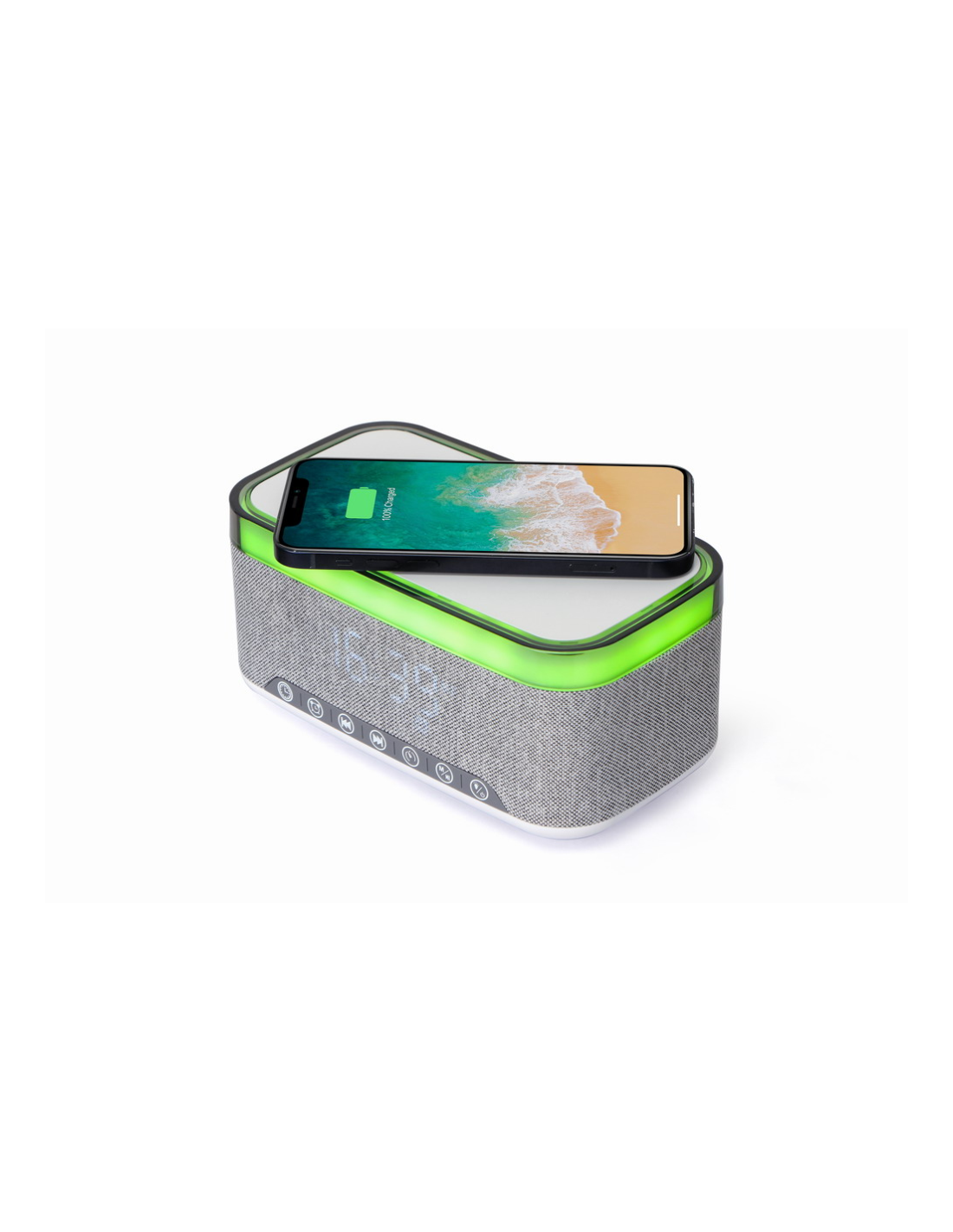 Reloj despertador digital con función de carga inalámbrica.