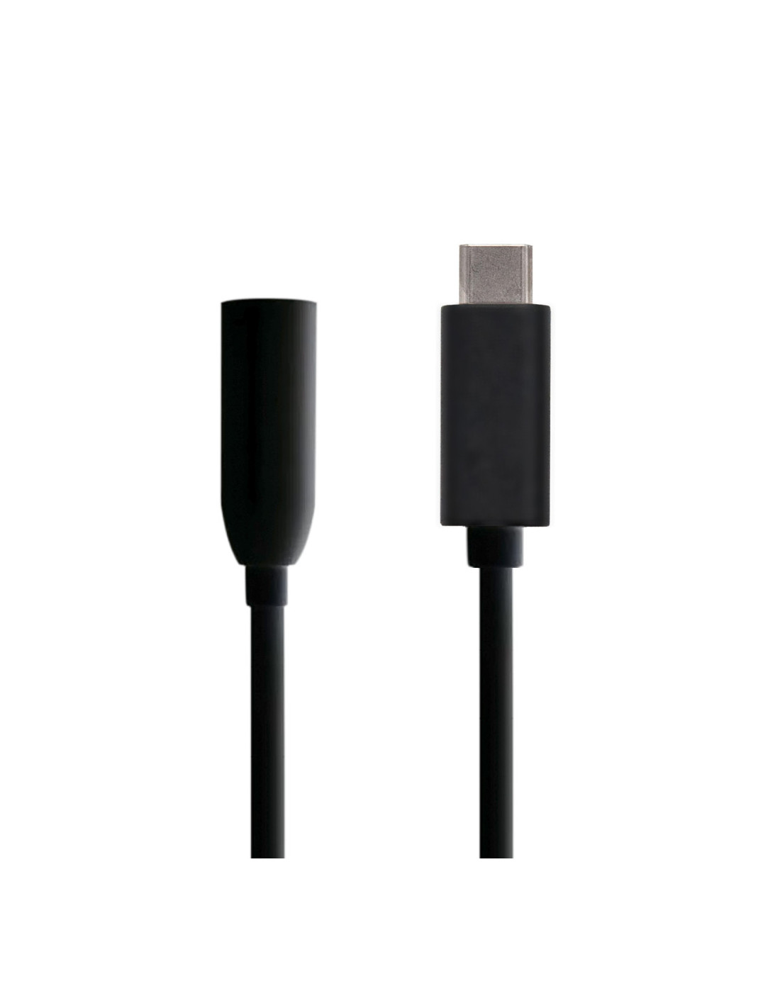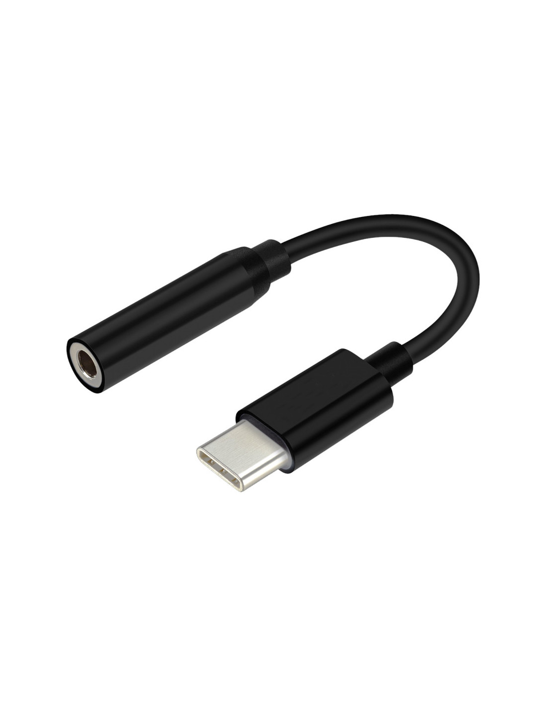 Conversor USB-C a AUDIO, con conector USB-C en un extremo y JACK 3.5 4 pines hembra en el otro.