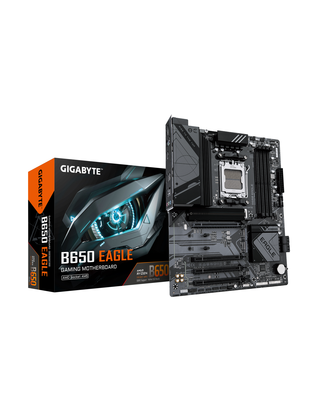 GIGABYTE B650 EAGLE Placa base - AMD Ryzen serie 9000, VRM de 12+2+2 fases, hasta 7600 MHz DDR5 (OC), 1xPCIe 5.0 + 2xPCIe 4.0 M.2, LAN GbE, USB 3.2 Gen 2. Fabricante de procesador: AMD, Socket de procesador: Zócalo AM5, Procesador compatible: AMD Ryzen 7000 Series, AMD Ryzen 8000 Series, AMD Ryzen 9000 Series. tipos de memoria compatibles: DDR5-SDRAM, Memoria interna máxima: 256 GB, Tipo de ranuras de memoria: DIMM. Interfaces de disco de almacenamiento soportados: M.2, SATA III, Tipos de unidades de almace