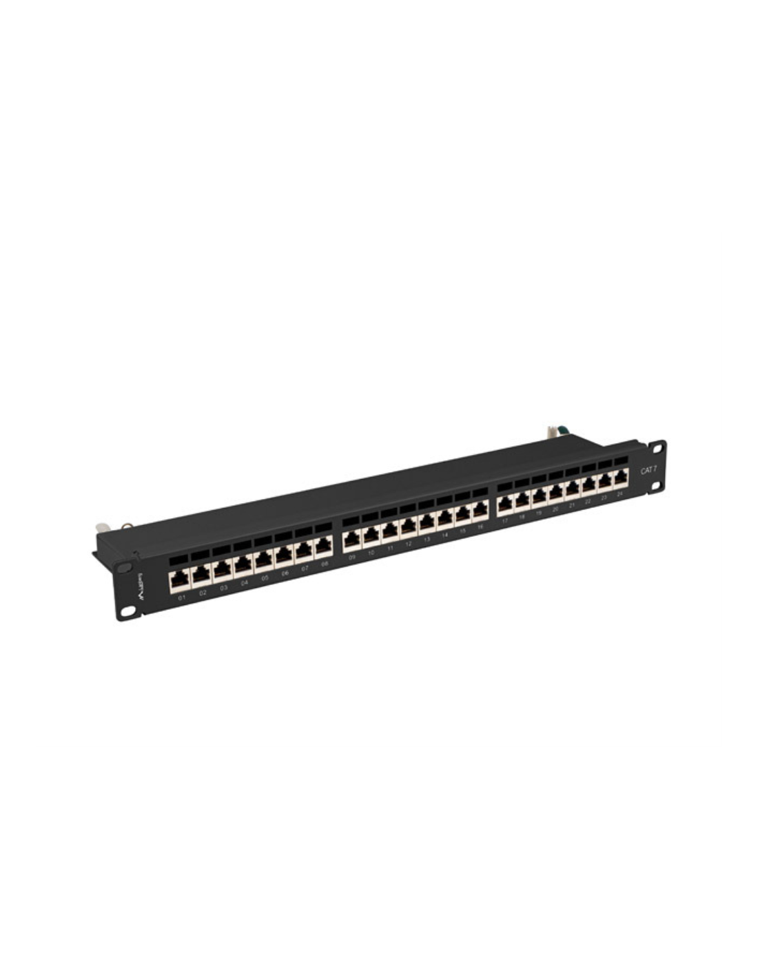 Lanberg PPS7-1024-B. Tipos de cable soportados: Cat7, Blindaje de cable: F/UTP (FTP). Color del producto: Negro, Material: ABS, Metal, Montaje: Montaje en bastidor. Ancho: 445 mm, Altura: 44,5 mm, Profundidad: 102 mm