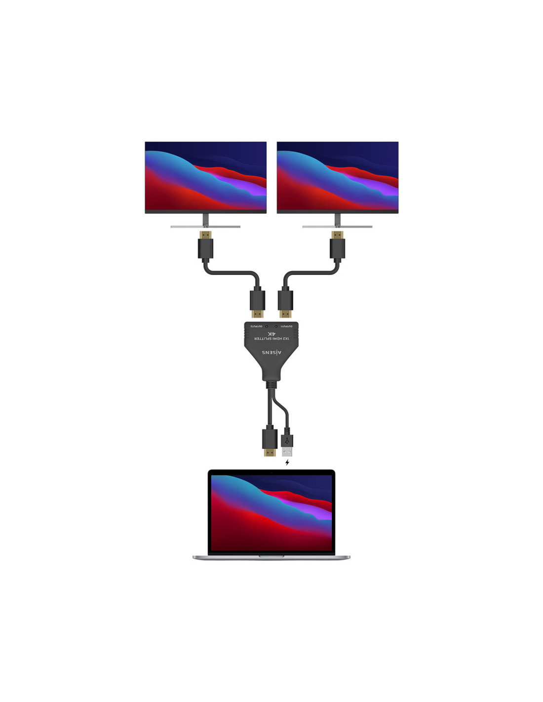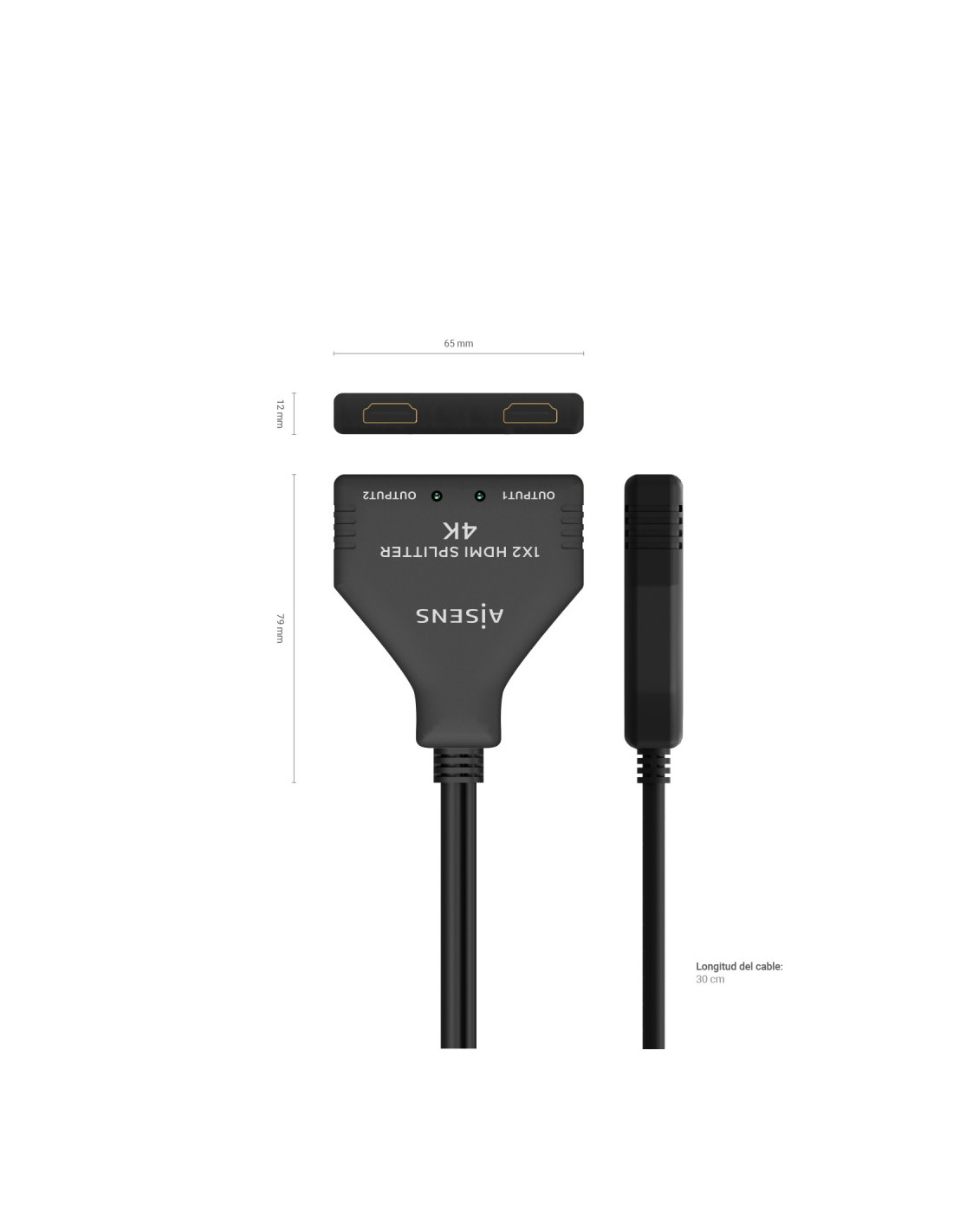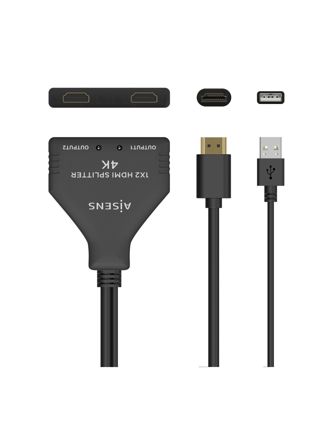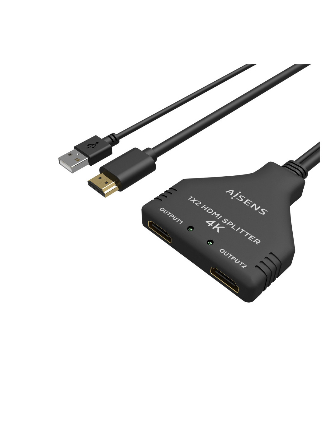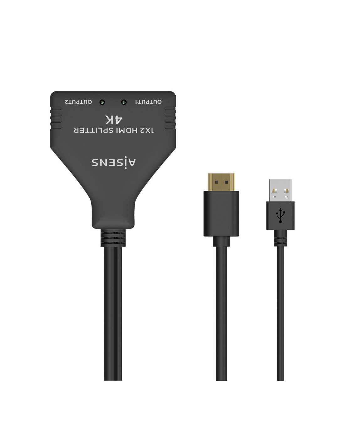 AISENS® – HDMI duplicador (splitter) 1×2 (una entrada, dos salidas) con pigtail (cable hdmi) 30 cm y fuente de alimentación (Cable USB 50cm).