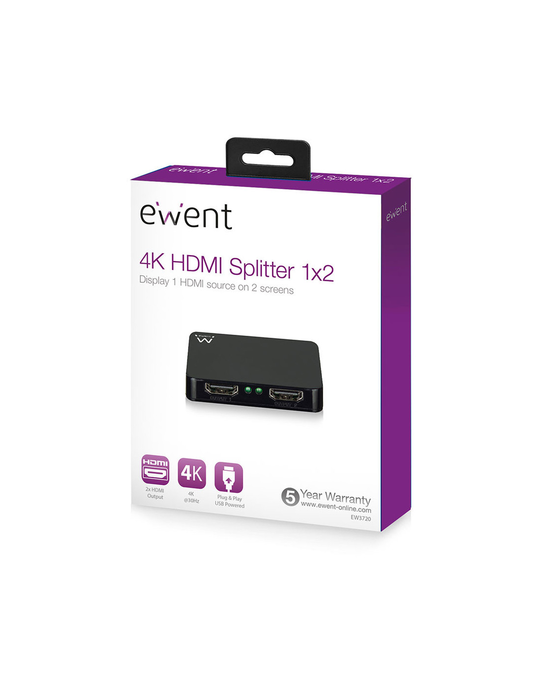 El Divisor 4K HDMI Ewent EW3720 4K divide una sola señal HDMI en dos televisores/pantallas independientes. Conecte el EW3720 con un cable HDMI de alta velocidad con una resolución máxima de 4K de 3840x2160 a 30 Hz y una resolución (3D) de 1080p a 60Hz. El EW3720 se proporciona con un cable de alimentación USB.