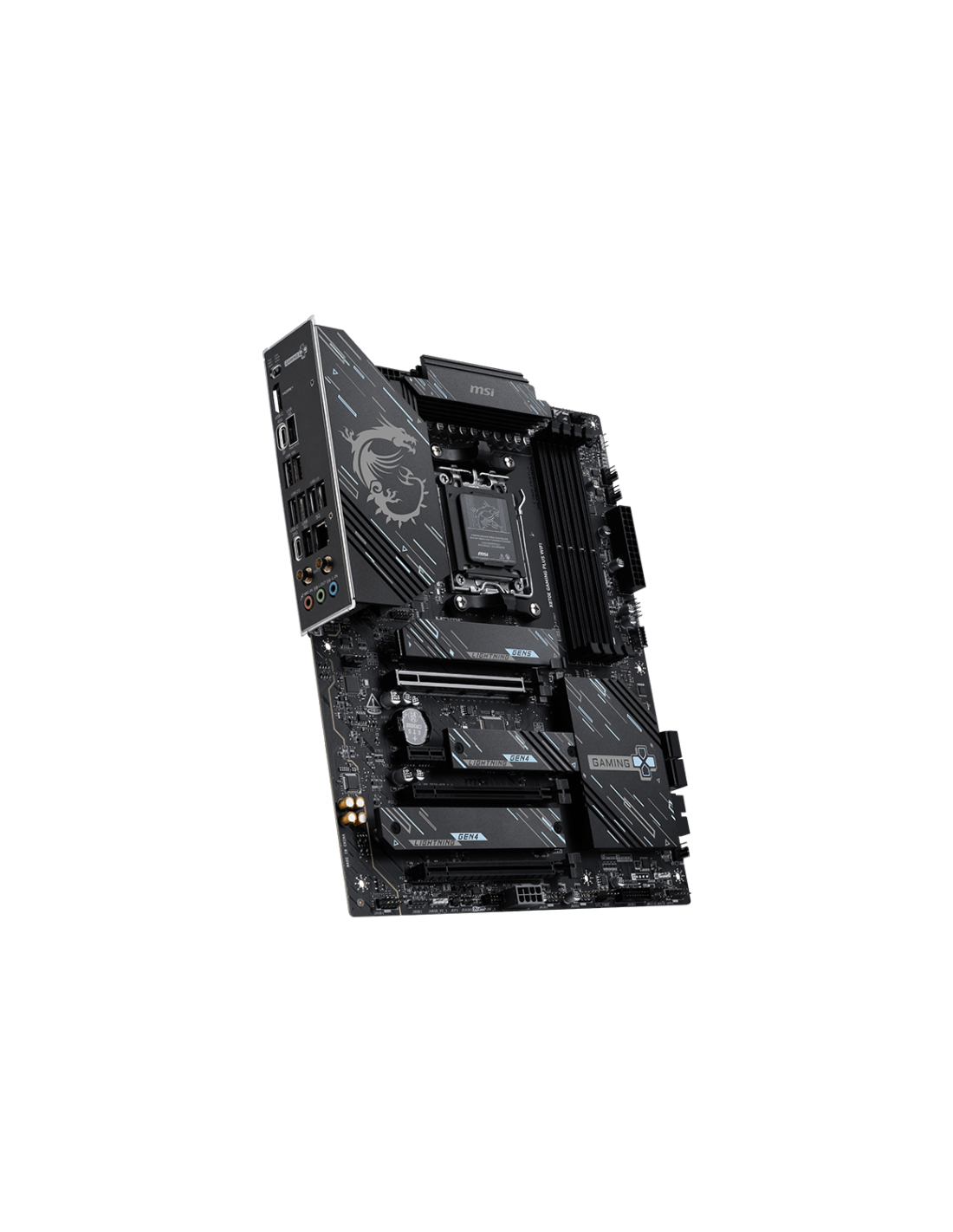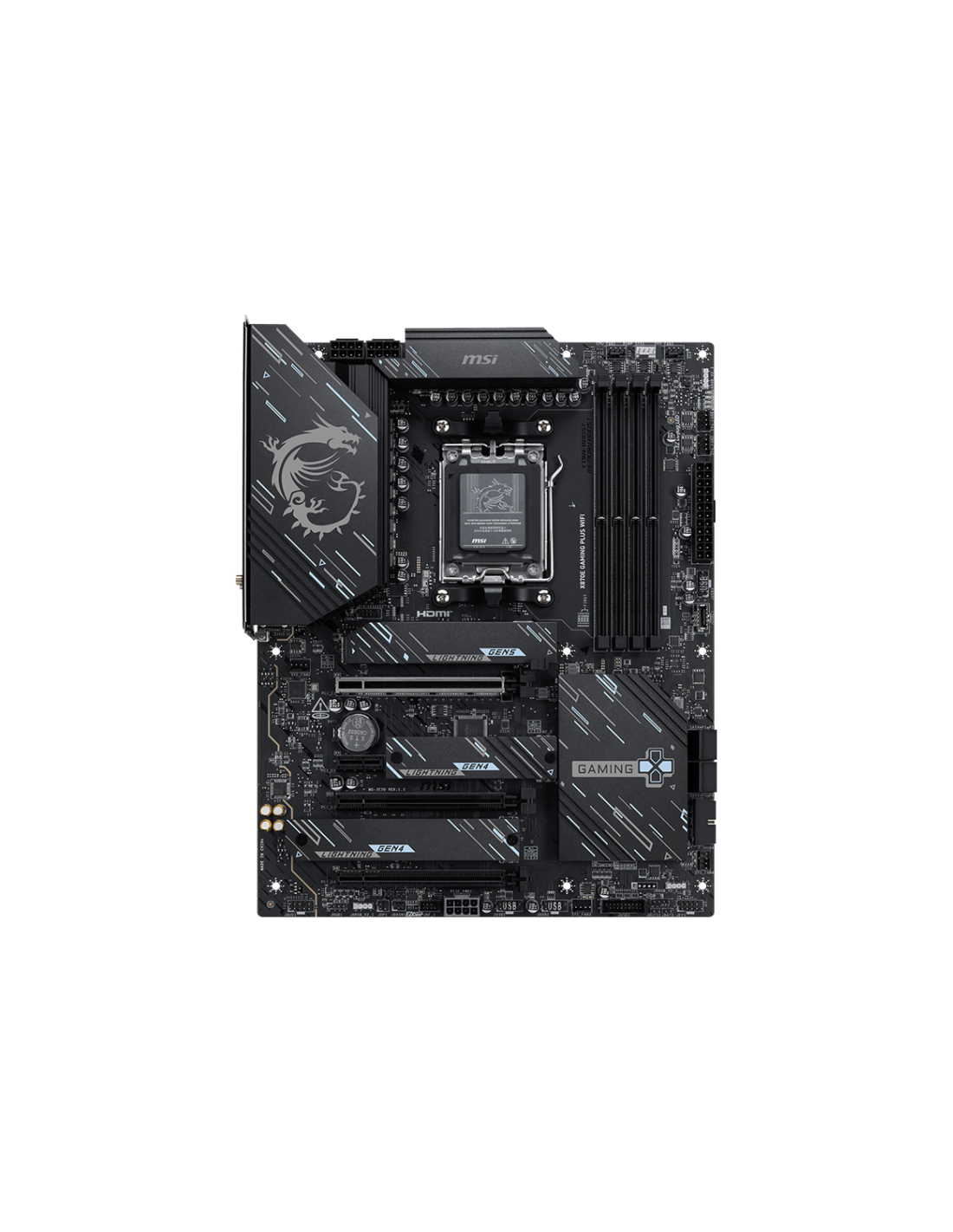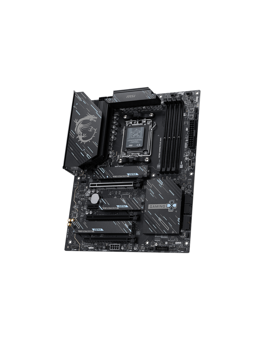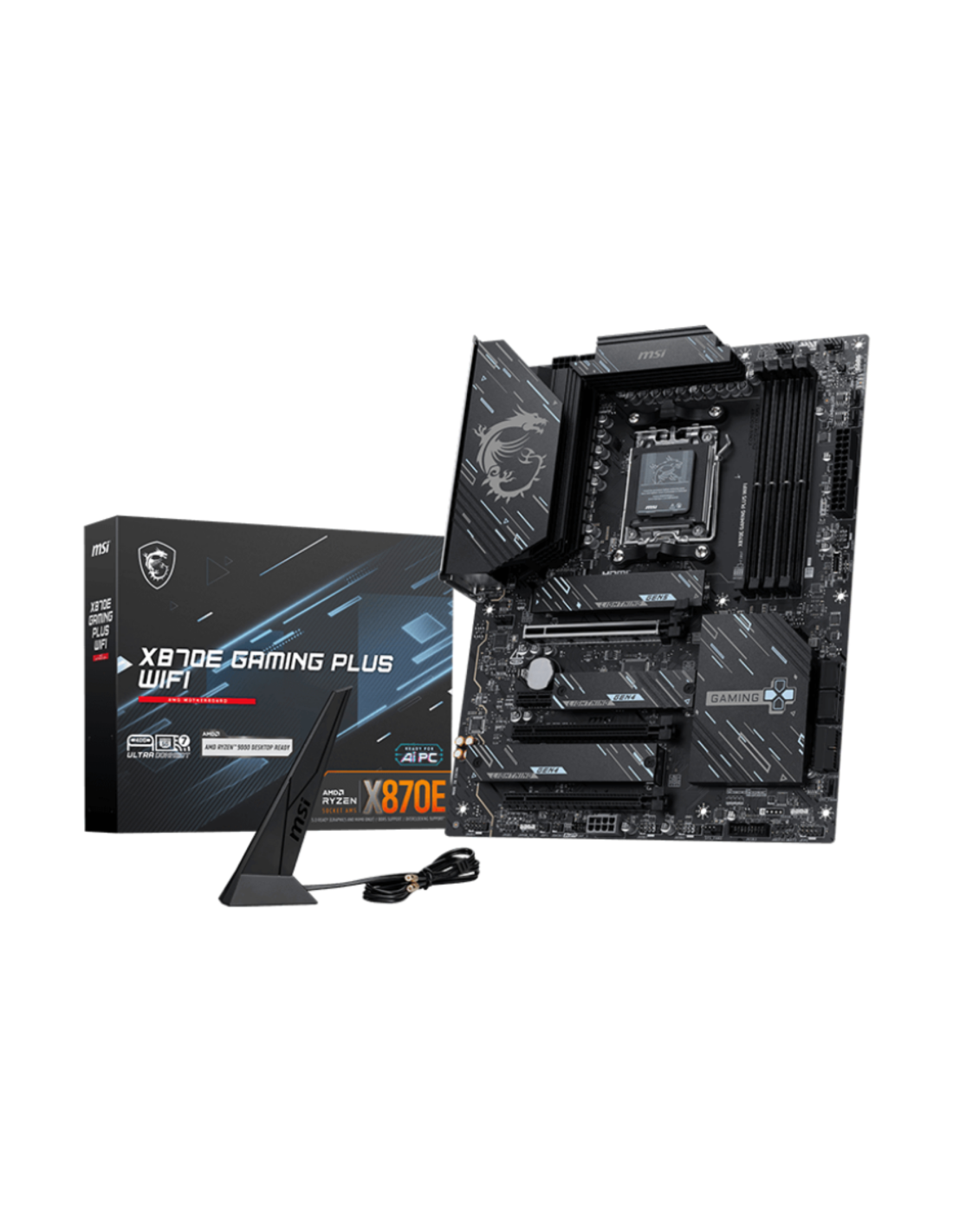 MSI X870E GAMING PLUS WIFI. Fabricante de procesador: AMD, Socket de procesador: Zócalo AM5, Procesador compatible: AMD Ryzen 7000 Series, AMD Ryzen 8000 Series, AMD Ryzen 9000 Series. tipos de memoria compatibles: DDR5-SDRAM, Memoria interna máxima: 256 GB, Tipo de ranuras de memoria: DIMM. Tipos de unidades de almacenamiento admitidas: Unidad de disco duro, Niveles RAID: 0, 1, 5, 10. Máxima resolución: 3840 x 2160 Pixeles. Tipo de interfaz ethernet: 5 Gigabit Ethernet, Estándar Wi-Fi: Wi-Fi 7 (802.11be),