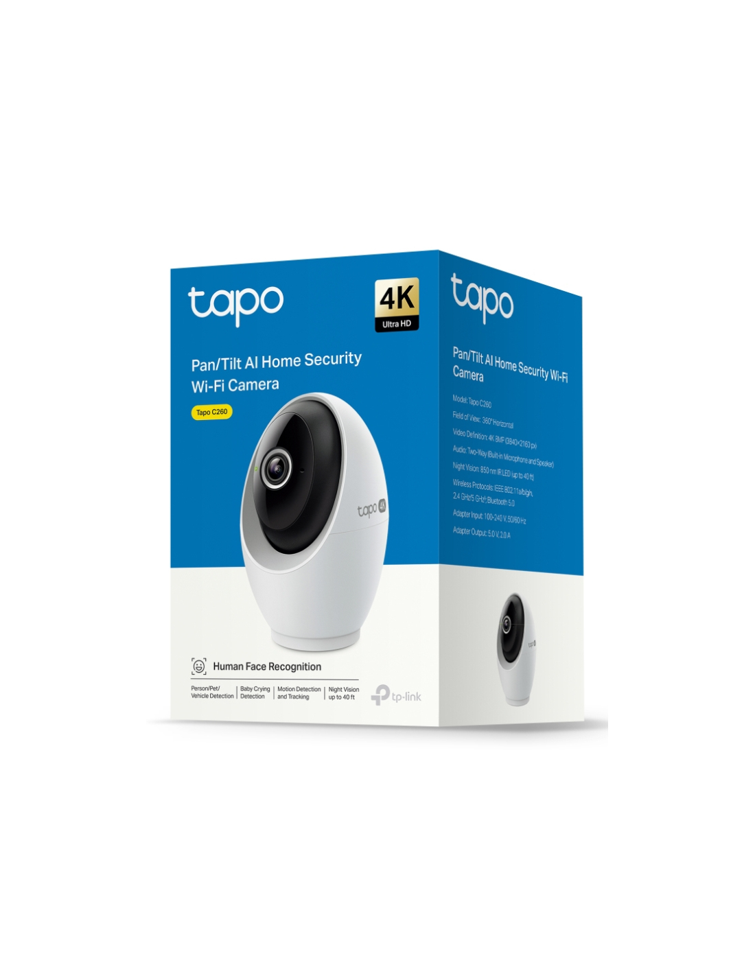 TP-Link Tapo C260. Tipo: Cámara de seguridad IP, Colocación soportada: Interior, Tecnología de conectividad: Inalámbrico. Tipo de montaje: Techo/Pared/Escritorio, Color del producto: Blanco. Ángulo de campo de visión (FOV): 98°, Ángulo de visión de la lente, horizontal: 91.5°, Ángulo de visión de la lente, vertical: 46.1°. Tipo de sensor: CMOS, Tamaño del sensor óptico: 25,4 / 2,7 mm (1 / 2.7"). Zoom digital: 18x, Diámetro de lente: 6,9 mm, Intervalo de longitud focal: 4.3 mm
