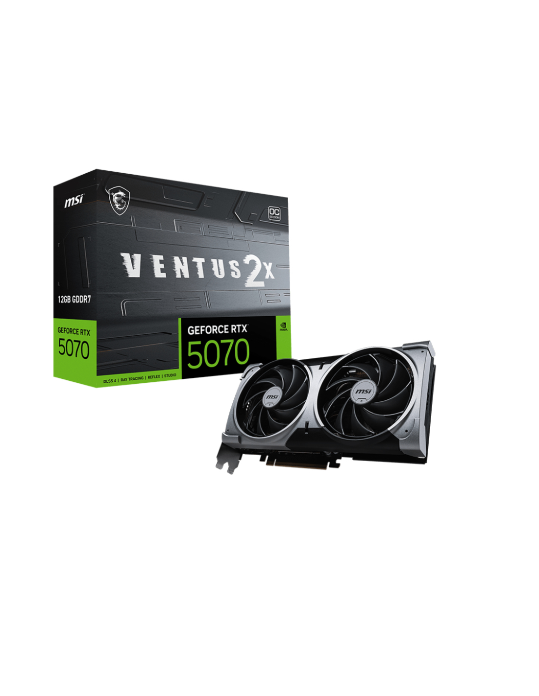 MSI GeForce RTX 5070 12G VENTUS 2X OC. Familia de procesadores de gráficos: NVIDIA, Procesador gráfico: GeForce RTX 5070. Capacidad memoria de adaptador gráfico: 12 GB, Tipo de memoria de adaptador gráfico: GDDR7, Ancho de datos: 192 bit. Máxima resolución: 7680 x 4320 Pixeles. Versión DirectX: 12 Ultimate, Versión OpenGL: 4.6. Tipo de interfaz: PCI Express 5.0. Tipo de enfriamiento: Activo, Número de ventiladores: 2 Ventilador(es)