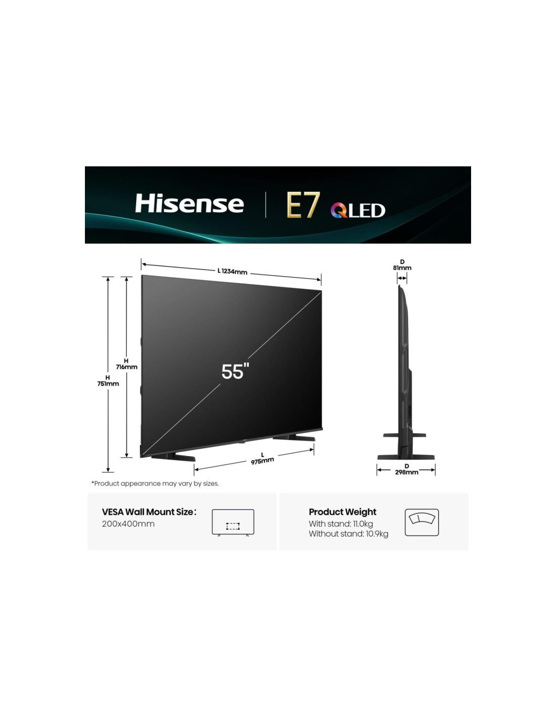 Hisense 55E77Q. Diagonal de la pantalla: 139,7 cm (55"), Resolución de la pantalla: 3840 x 2160 Pixeles, Tipo HD: 4K Ultra HD, Tecnología de visualización: QLED, Forma de la pantalla: Plana. Smart TV. Tiempo de respuesta: 8 ms, Razón de contraste (típica): 3800:1, Relación de aspecto nativa: 16:9. Formato de señal digital: DVB-C, DVB-S, DVB-S2, DVB-T, DVB-T2. Wifi, Ethernet. Color del producto: Negro