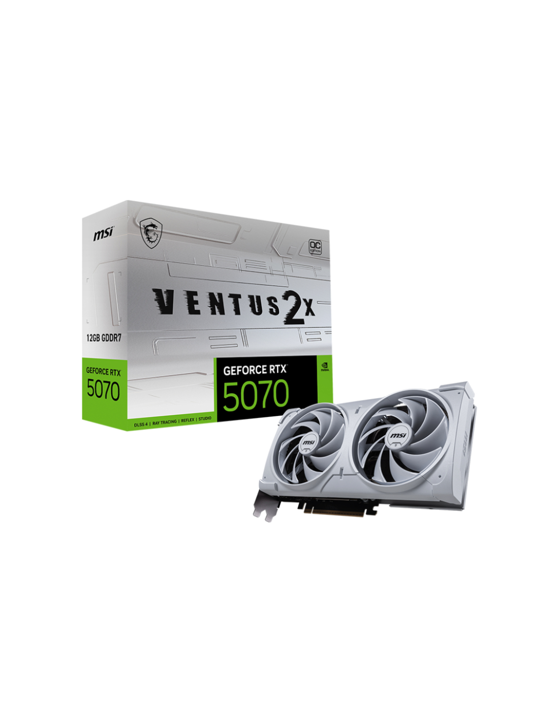 MSI GeForce RTX5070 VENTUS 2X OC White. Familia de procesadores de gráficos: NVIDIA, Procesador gráfico: GeForce RTX 5070. Capacidad memoria de adaptador gráfico: 12 GB, Tipo de memoria de adaptador gráfico: GDDR7, Ancho de datos: 192 bit. Máxima resolución: 7680 x 4320 Pixeles. Versión DirectX: 12 Ultimate, Versión OpenGL: 4.6. Tipo de interfaz: PCI Express 5.0. Tipo de enfriamiento: Activo, Número de ventiladores: 2 Ventilador(es)