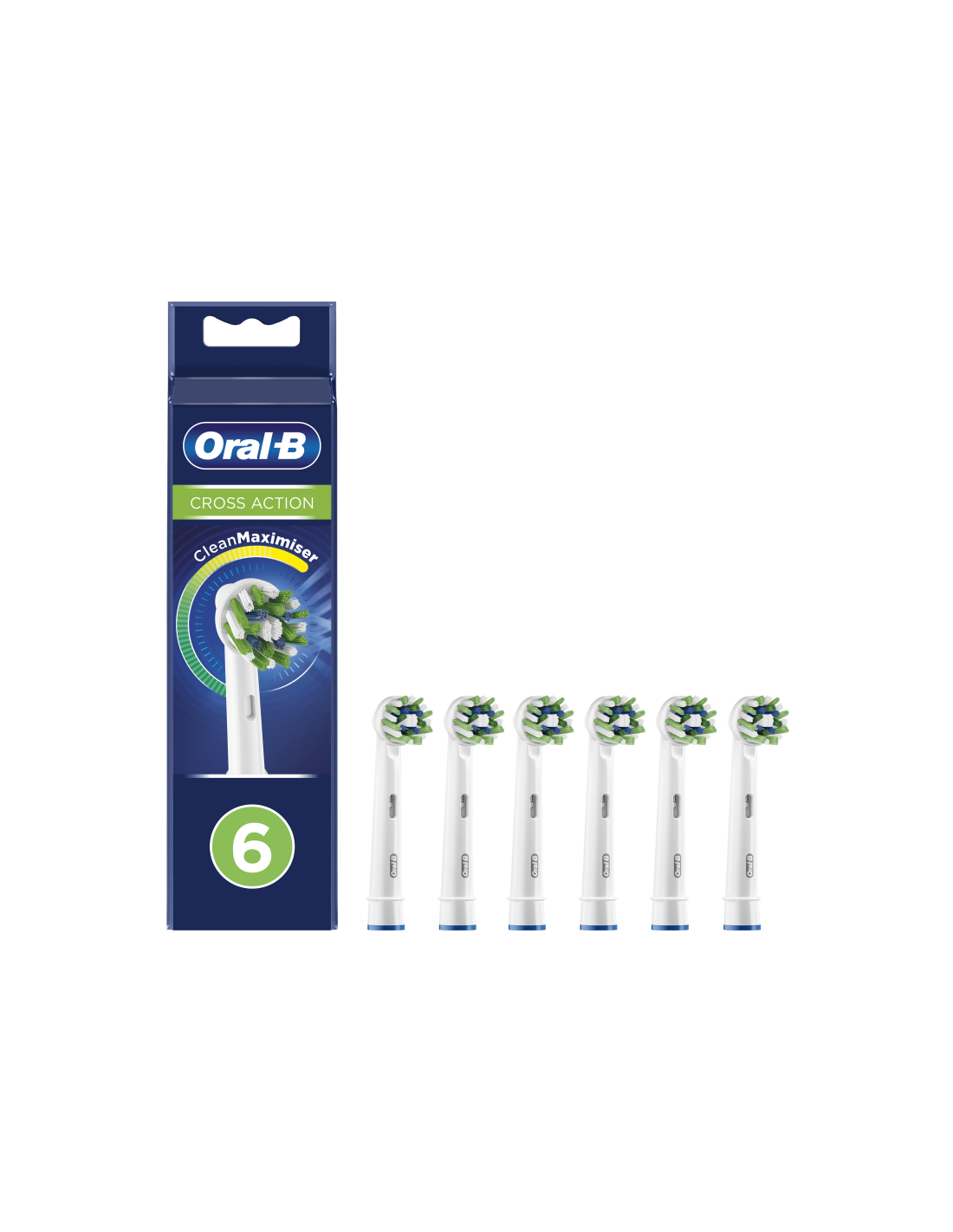 Oral-B CrossAction 80339345. Número de cabezales incluido: 6 pieza(s), Color del producto: Azul, Verde, Blanco, Plazo de sustitución del cepillo de limpieza: 3 mes(es). Peso: 32,7 g. Ancho del paquete: 33 mm, Profundidad del paquete: 60 mm, Altura del paquete: 220 mm. Cantidad por paquete: 6 pieza(s), Ancho de la caja principal: 149 mm, Longitud de la caja: 217 mm. Cantidad de paquetes en el interior: 6 pieza(s)
