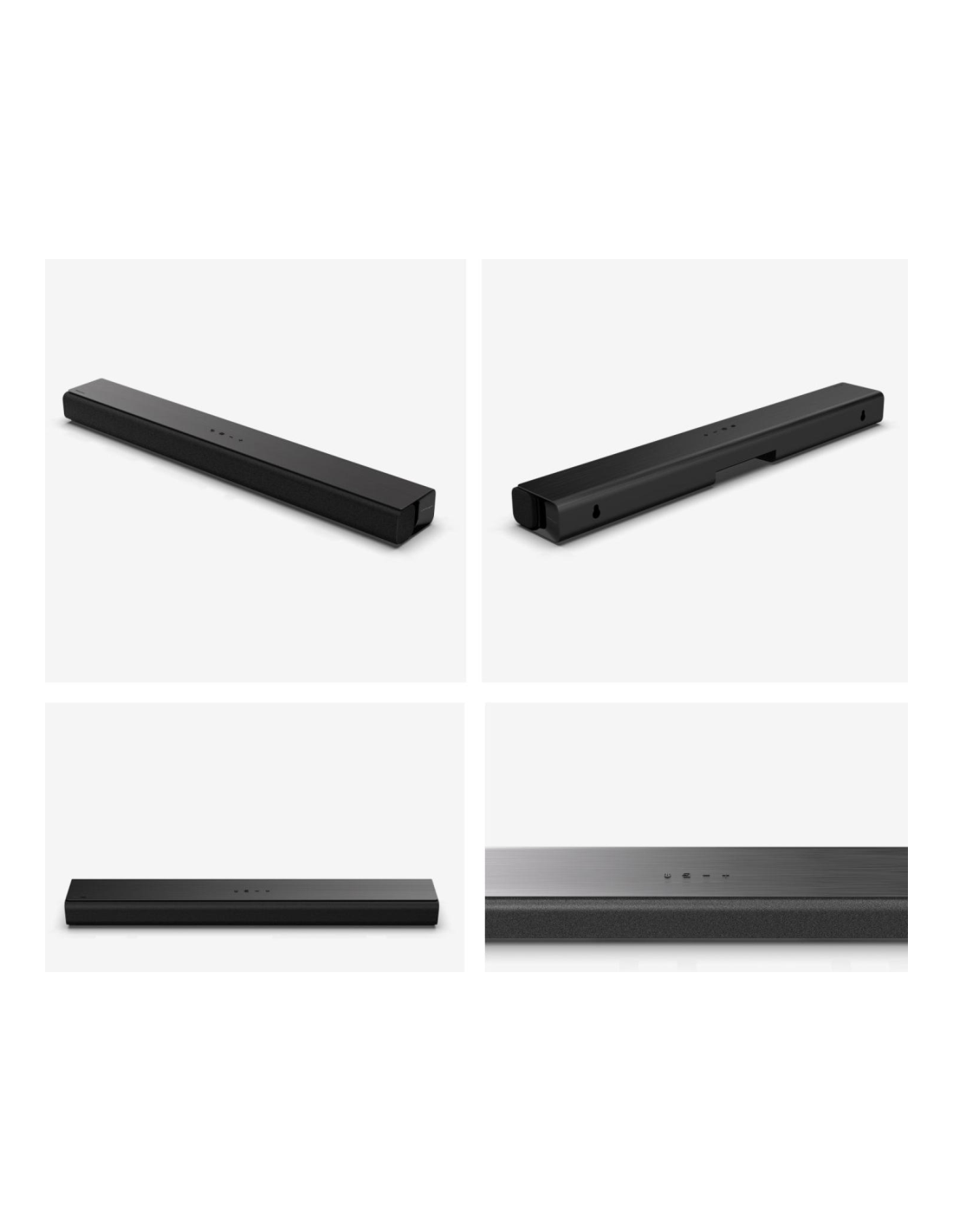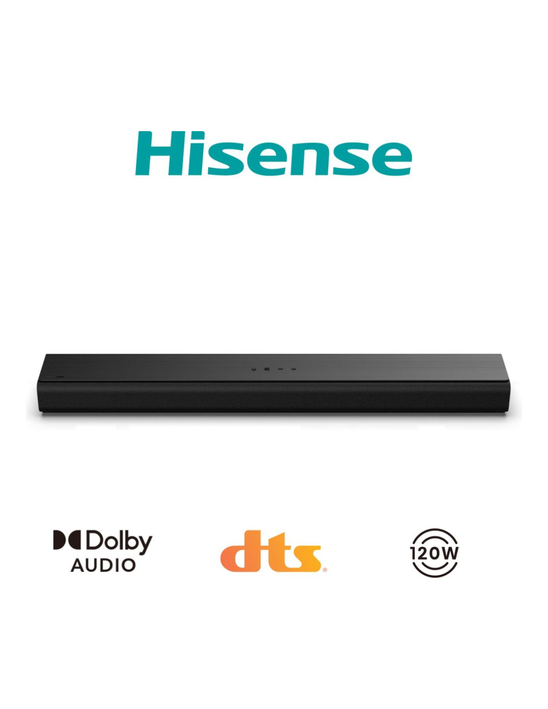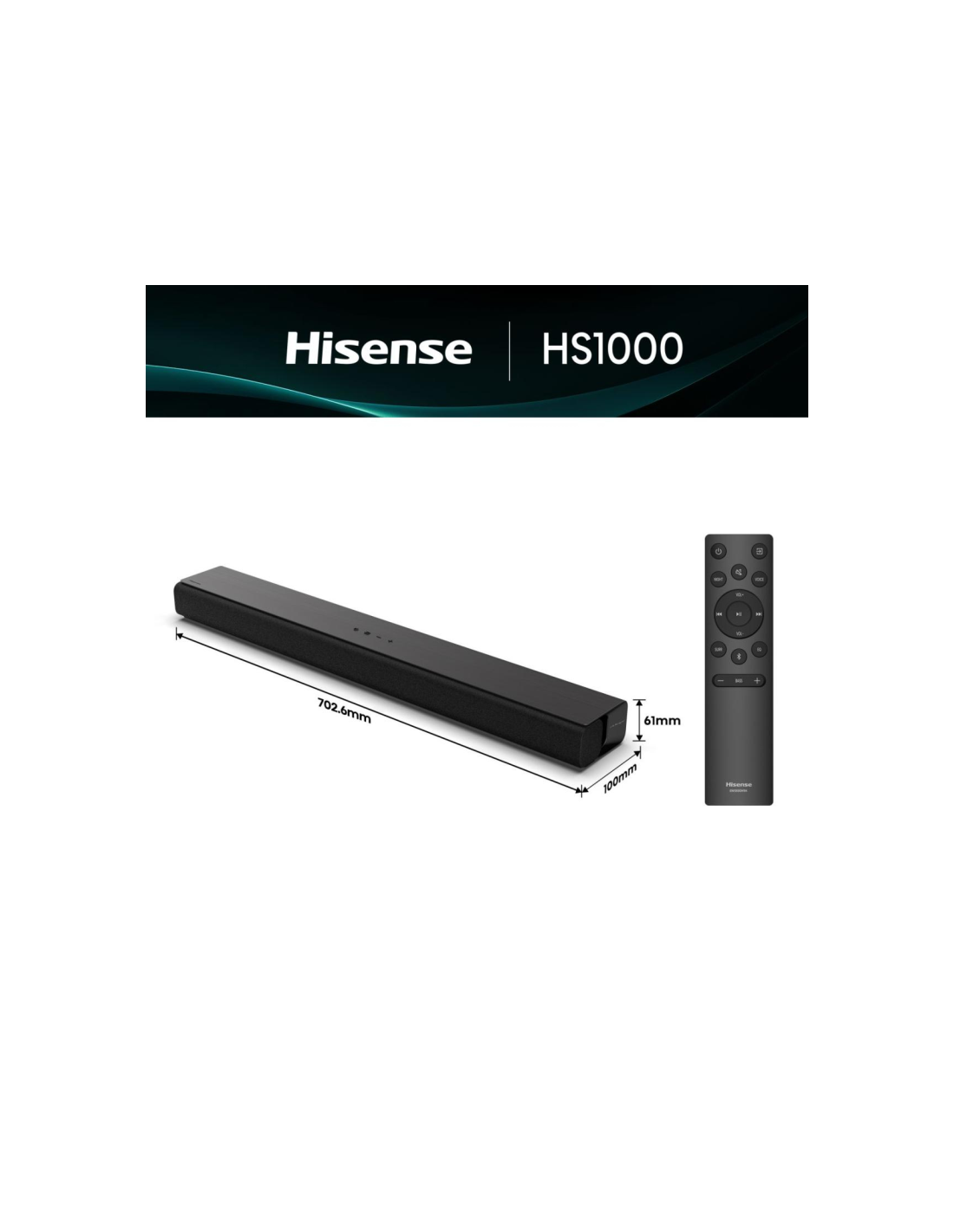 Hisense HS1000. Canales de salida de audio: 2.0 canales, Potencia estimada RMS: 120 W, Decodificadores incorporados: DTS Virtual:X, Dolby Audio, Dolby Digital Plus. Color del producto: Negro. Tecnología de conectividad: Alámbrico. Voltaje de entrada AC: 100-240 V, Frecuencia de entrada AC: 50-60 Hz, Consumo eléctrico de la barra de sonido: 120 W. Ancho: 702 mm, Profundidad: 100 mm, Altura: 57 mm