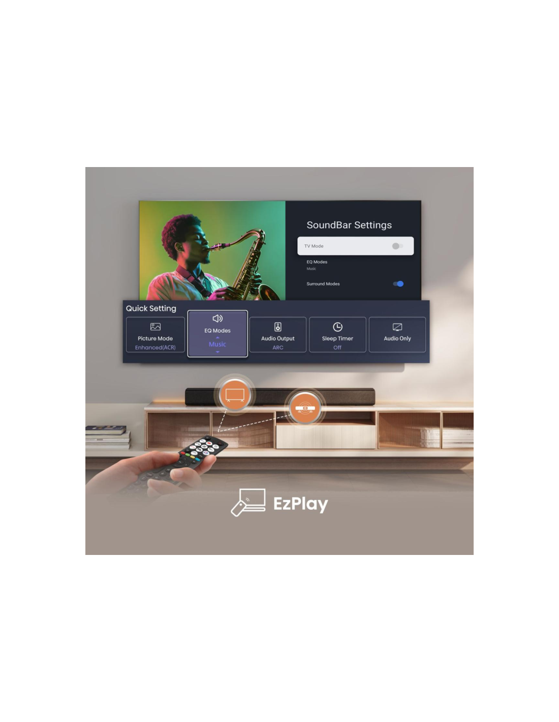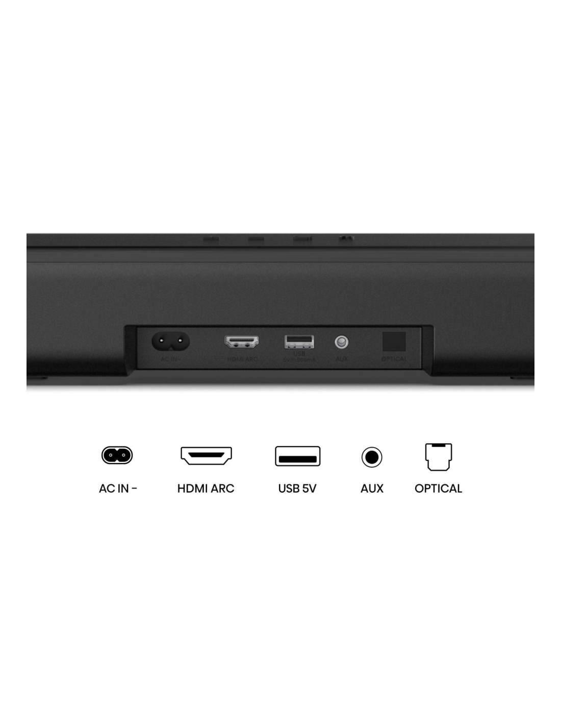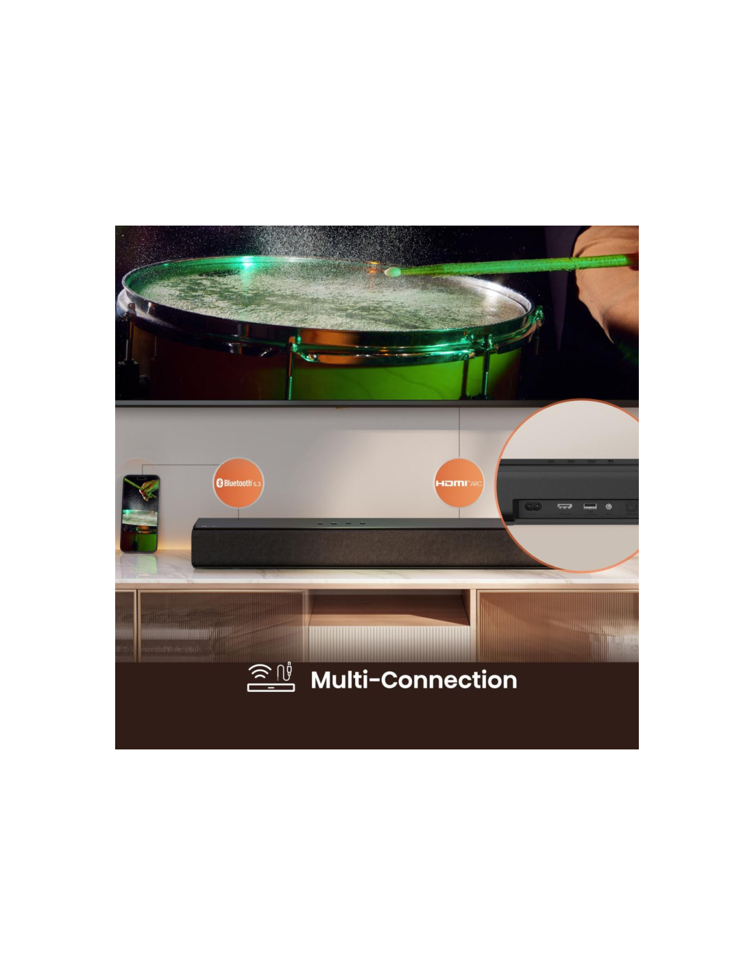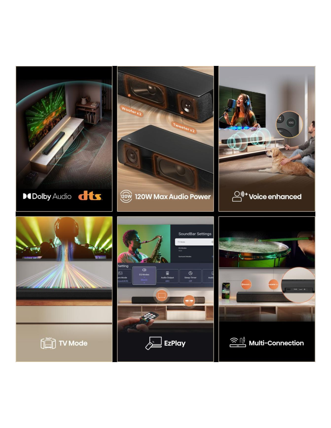 Hisense HS1000. Canales de salida de audio: 2.0 canales, Potencia estimada RMS: 120 W, Decodificadores incorporados: DTS Virtual:X, Dolby Audio, Dolby Digital Plus. Color del producto: Negro. Tecnología de conectividad: Alámbrico. Voltaje de entrada AC: 100-240 V, Frecuencia de entrada AC: 50-60 Hz, Consumo eléctrico de la barra de sonido: 120 W. Ancho: 702 mm, Profundidad: 100 mm, Altura: 57 mm