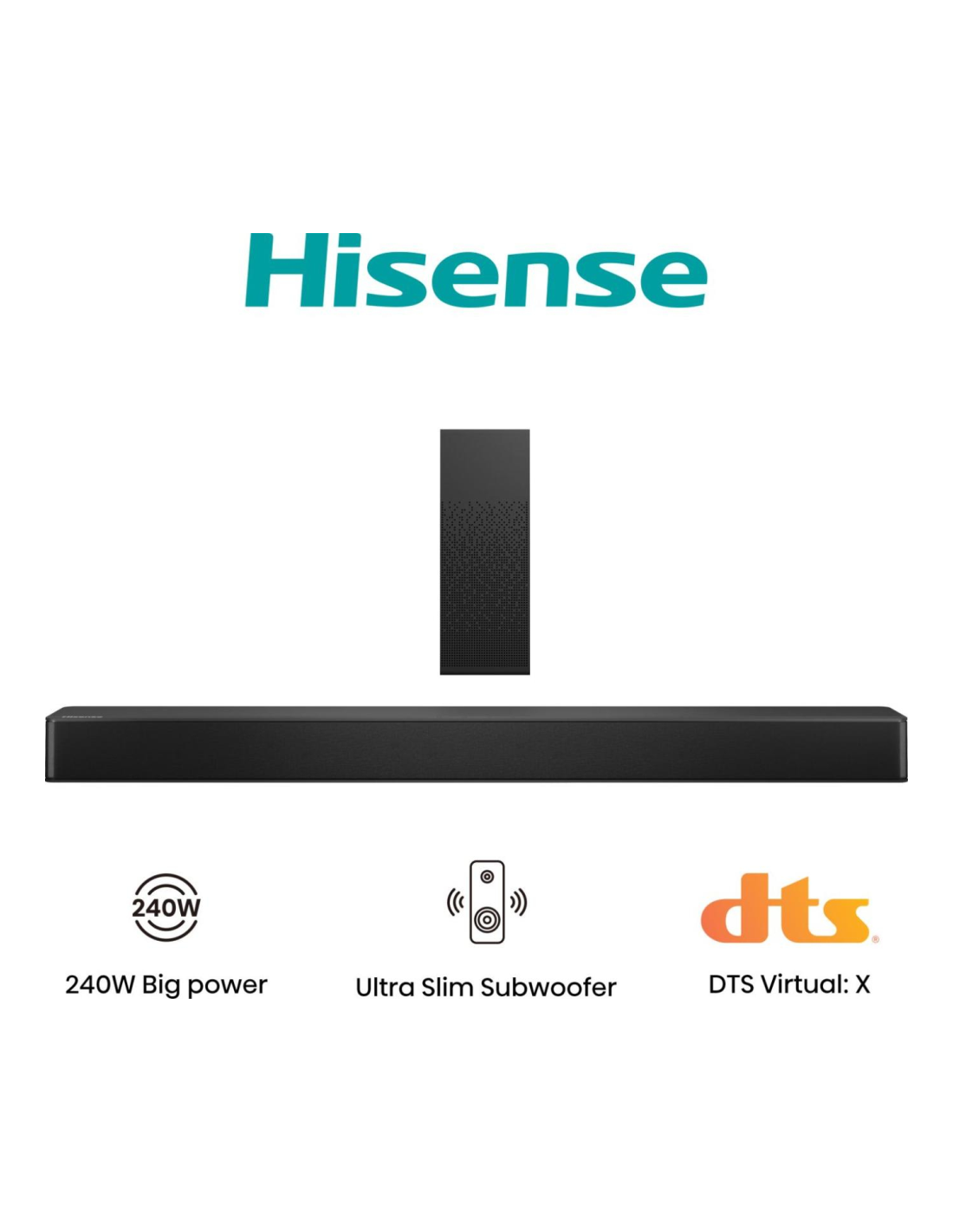 Hisense HS2100. Canales de salida de audio: 2.1 canales, Potencia estimada RMS: 240 W, Decodificadores incorporados: DTS Virtual:X, Dolby Digital, Dolby Digital Plus. Potencia de la barra de sonido del altavoz RMS: 120 W, Divisor de frecuencia: 20000 Hz, Diámetro del woofer (imperial): 13,3 cm (5.25"). Tipo de subwoofer: Altavoz de subgraves (subwoofer) activo, Conectividad del altavoz de subgraves (subwoofer): Inalámbrico, Potencia RMS de subwoofer: 120 W. Color del producto: Negro, Formatos de audio sopor