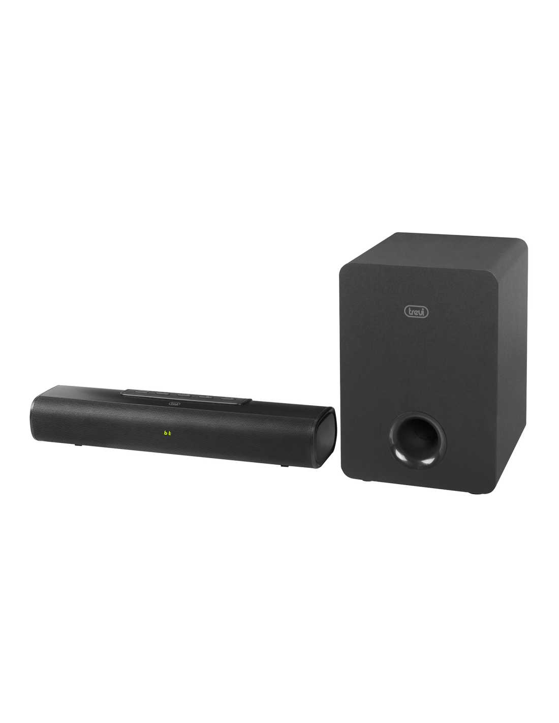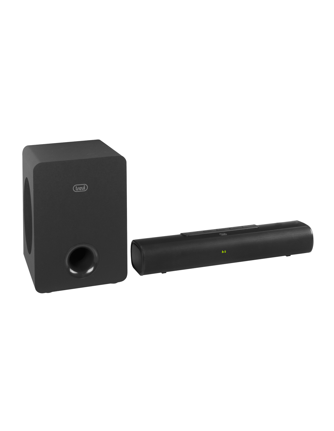 Trevi SB 8380 SW. Canales de salida de audio: 2.1 canales, Potencia estimada RMS: 90 W. Diámetro del altavoz de graves (woofer) (altavoz de subgraves o subwoofer): 13,3 cm (5.25"). Color del producto: Negro, Tipo de visualizador: LED. Tecnología de conectividad: Inalámbrico y alámbrico. Voltaje de entrada AC: 110 - 240 V, Frecuencia de entrada AC: 50/60 Hz