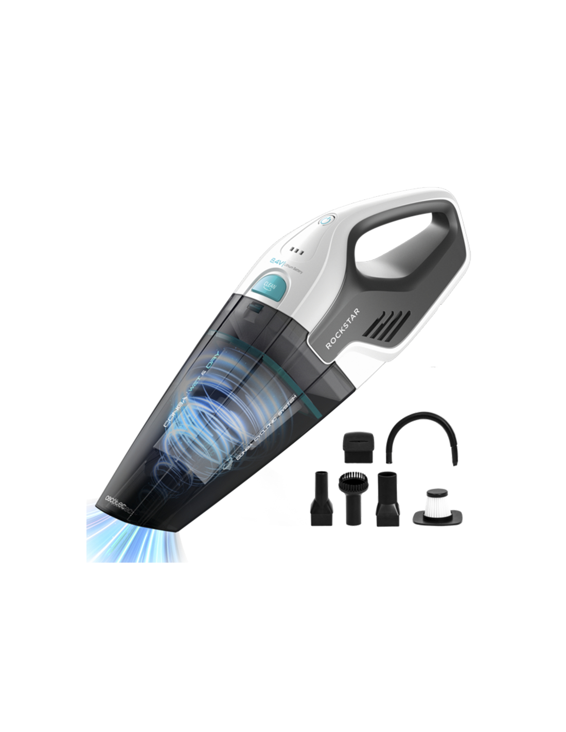 Cecotec Conga Rockstar. Tipo de limpiador: Secar, Filtración de aire en aspiradora: HEPA, Método de separación de la suciedad: Ciclónico. Tipo de depósito: Sin bolsa, Color del producto: Gris, Blanco, Capacidad del depósito del polvo en seco: 0,5 L. Fuente de energía: Batería, Potencia máx. de entrada: 50 W, Tiempo de funcionamiento: 20 min. Peso: 1 kg, Ancho: 95 mm, Profundidad: 125 mm. Cantidad por paquete: 1 pieza(s)