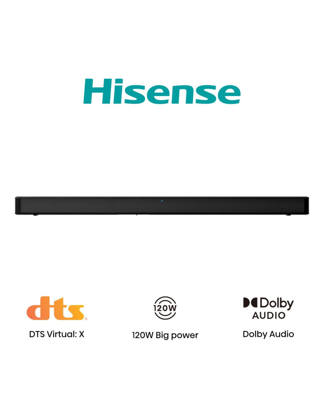 Gracias a sus dos altavoces integrados de 120 W de potencia máxima y a su diseño compacto, la barra de sonido Hisense mejora instantáneamente la experiencia de sonido de tu TV y se combina a la perfección con los televisores de tu hogar.