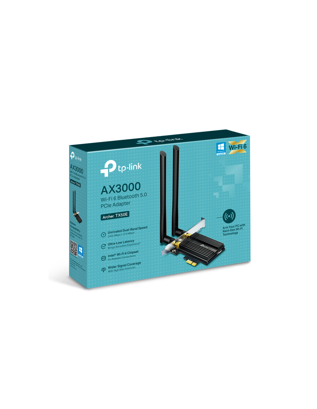 TP-Link Archer TX50E. Tecnología de conectividad: Inalámbrico, Interfaz de host: PCI Express, Interfaz: WLAN / Bluetooth. Rango máximo de transferencia de datos: 2402 Mbit/s, Estándar Wi-Fi: Wi-Fi 6 (802.11ax), Banda Wi-Fi: Doble banda (2,4 GHz / 5 GHz). Color del producto: Negro, Metálico