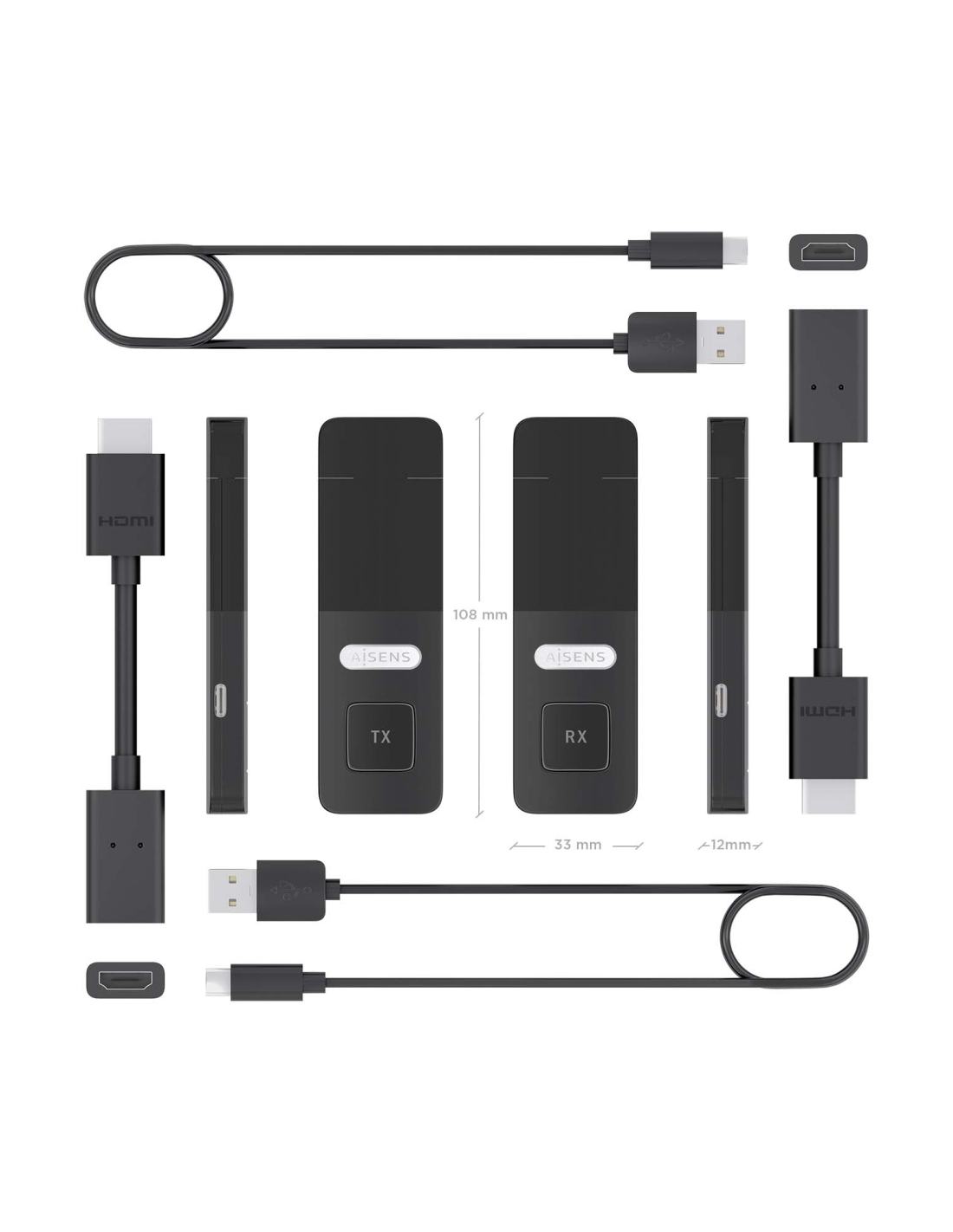 AISENS HDMI Inalambrico 1080p 30m, Negro. Tipo: Transmisor y receptor de señales AV, Máxima resolución: 1920 x 1080 Pixeles, Distancia de transferencia máxima: 30 m. Tecnología de conectividad: Inalámbrico, Conector USB: USB Tipo C. Alimentación: USB. Dimensiones de receptor (Ancho x Profundidad x Altura): 33 x 108 x 12 mm, Dimensiones del transmisor (An x P): 33 x 108 x 12 mm. Cantidad por paquete: 2 pieza(s), Ancho del paquete: 134,5 mm, Profundidad del paquete: 183,5 mm