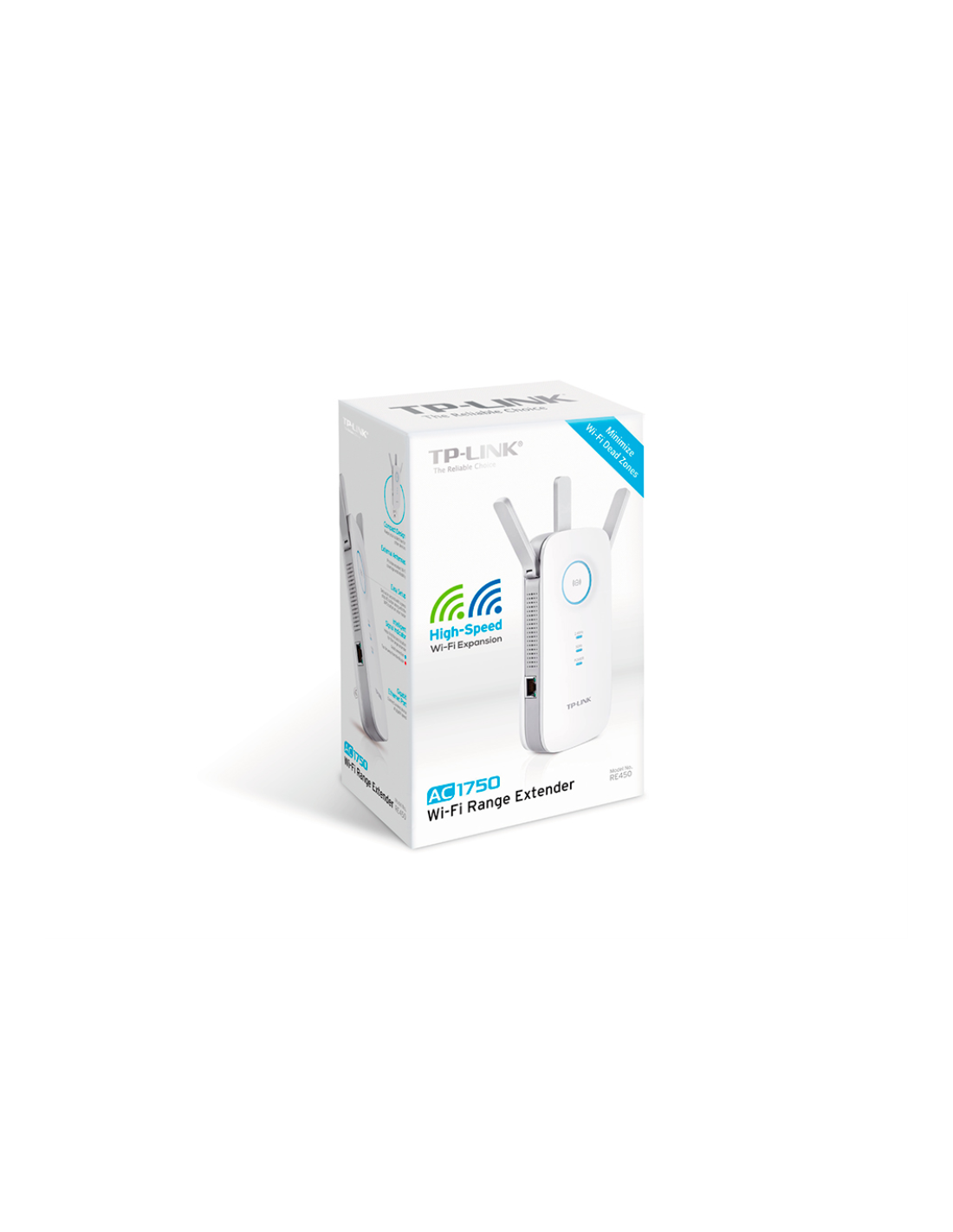 TP-Link RE450. Tipo: Transmisor de red, Velocidad de transferencia de datos: 1750 Mbit/s, Ethernet LAN, velocidad de transferencia de datos: 10,100,1000 Mbit/s. Tipo de antena: Externo. Tecnología de cableado: 10/100/1000Base-T(X), Estándares de red: IEEE 802.11a, IEEE 802.11ac, IEEE 802.11b, IEEE 802.11g, IEEE 802.11n, IEEE 802.3, IEEE 802.3ab,..., Wi-Fi estándares: 802.11a, Wi-Fi 5 (802.11ac), 802.11b, 802.11g, Wi-Fi 4 (802.11n). Color del producto: Blanco, Certificación: CE, FCC. Consumo de energía (max)