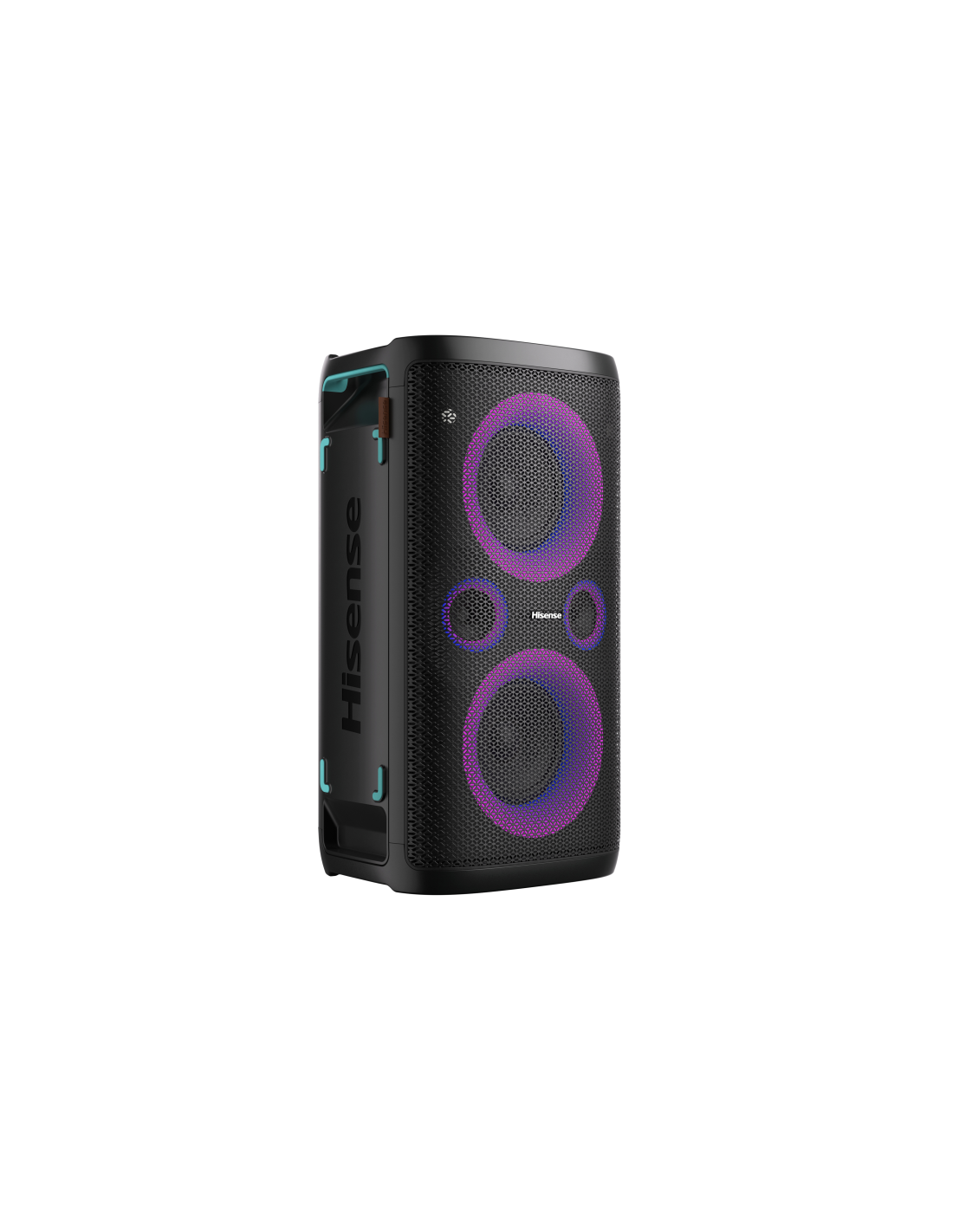 Hisense Party Storm. Potencia estimada RMS: 300 W, Rango de frecuencia: 50 - 60 Hz. Tecnología de conectividad: Inalámbrico. Tipo de producto: Altavoz para fiestas, Color del producto: Negro, Funciones de protección: Resistente al agua. Uso recomendado: Universal. Tipo de batería: Batería integrada, Capacidad de batería: 7650 mAh, Autonomía: 15 h