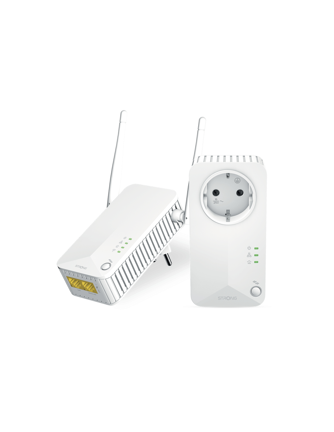 Strong Powerline Wi-Fi 600 Kit. Rango máximo de transferencia de datos: 600 Mbit/s, Estándares de red: IEEE 802.3, IEEE 802.3u, Conector: Tipo F. Voltaje de entrada AC: 100 - 240 V, Frecuencia de entrada AC: 50/60 Hz. Color del producto: Blanco. Certificados de conformidad: CE