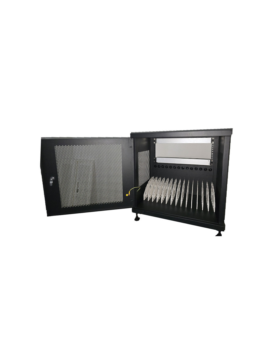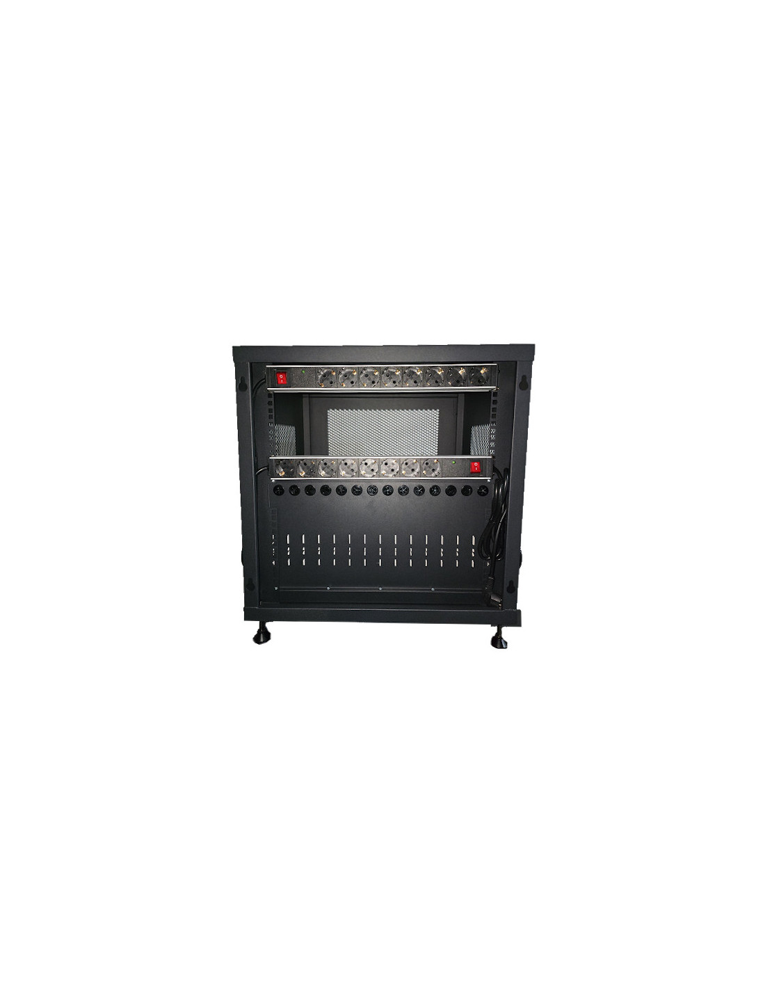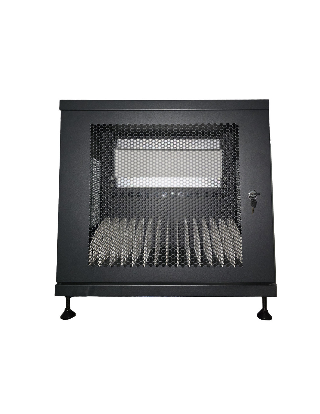 Para garantizar una ventilación óptima, la puerta frontal y el panel trasero están perforados. Además, la seguridad se mejora con una cerradura con llave. Los paneles laterales fijos cuentan con una sección perforada central para facilitar el intercambio de calor y los orificios para el paso de cables están equipados con pasacables de goma. En el interior, un estante con 14 divisores de metal y pasacables permite una gestión ordenada de los cables.
