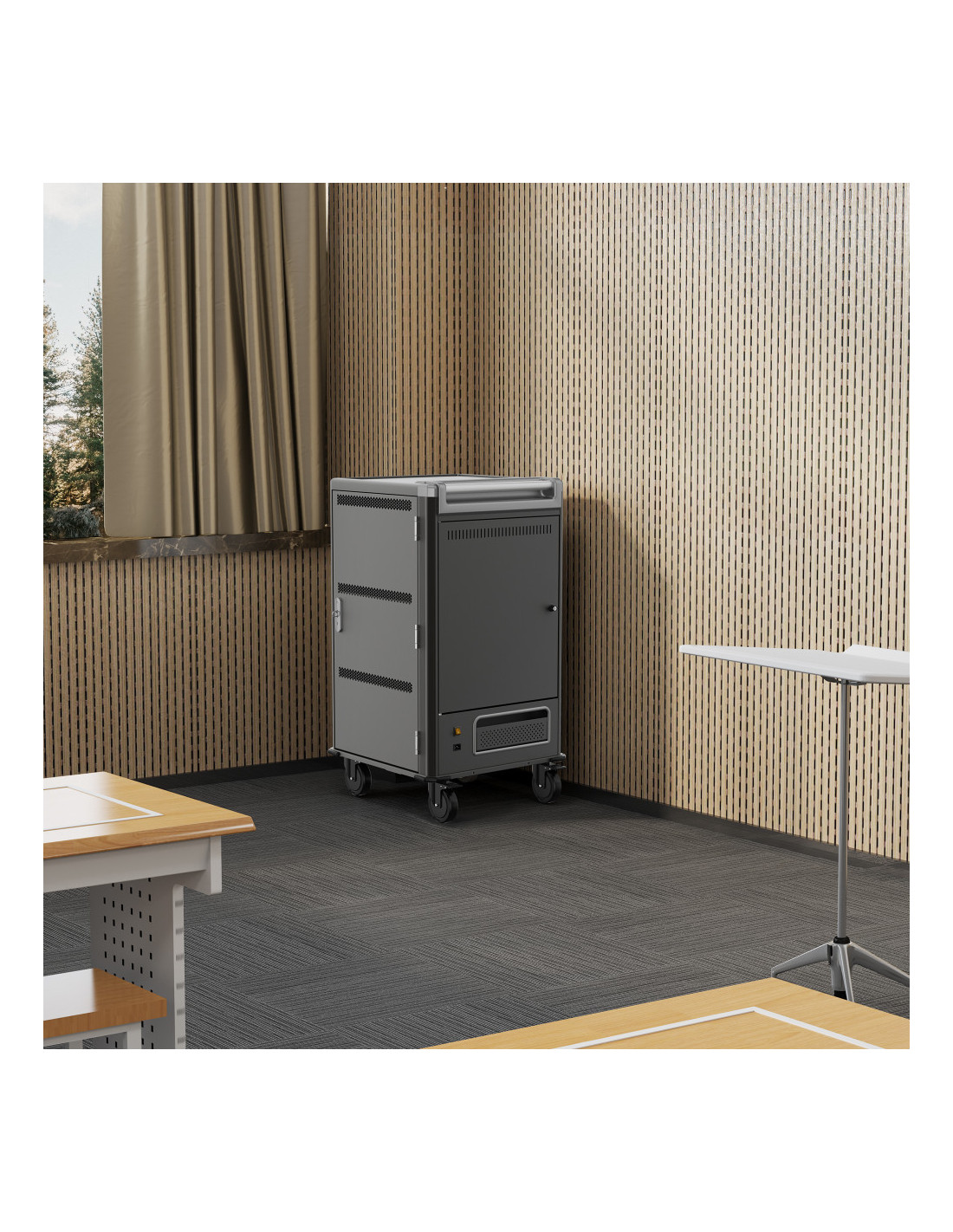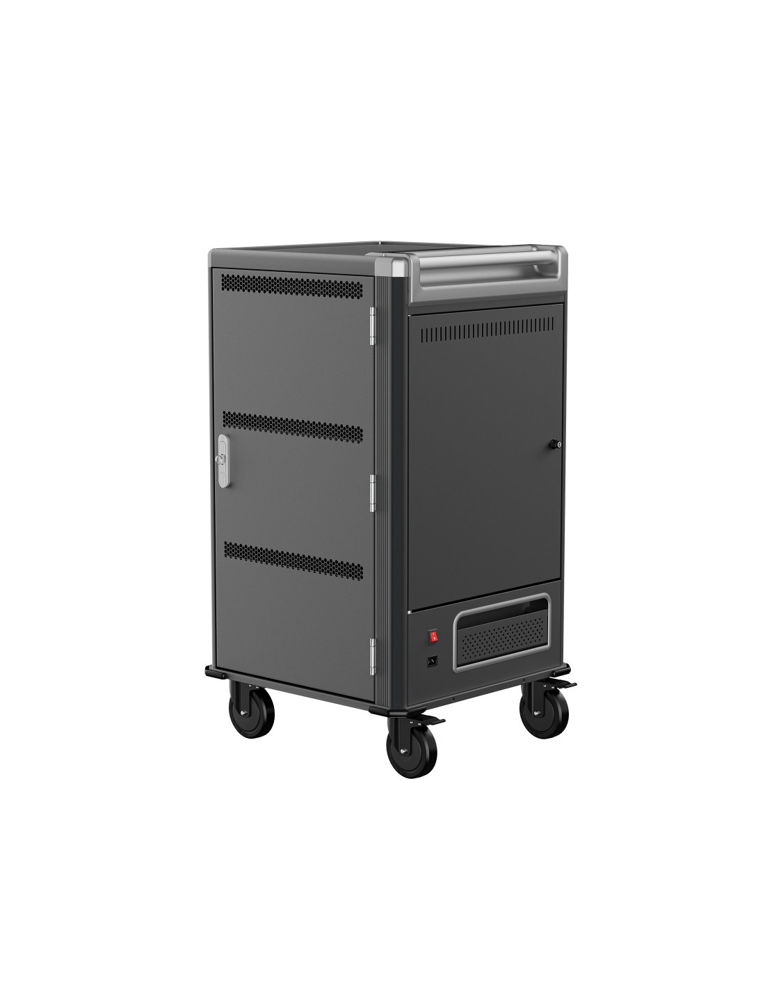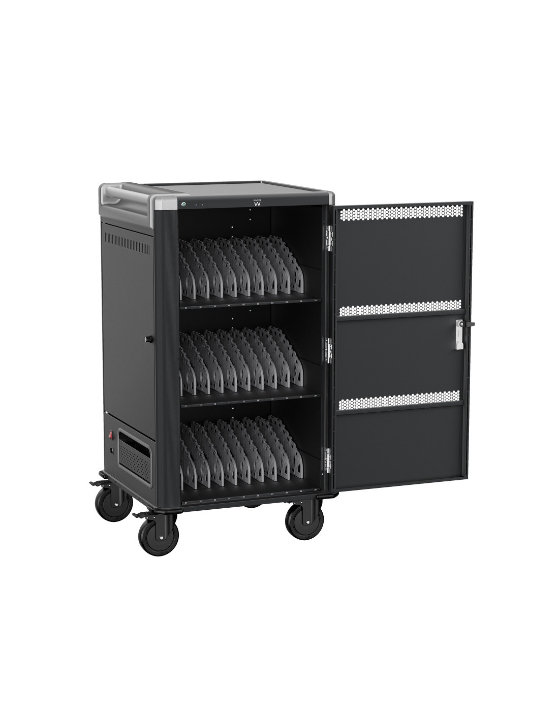 El carro de carga EW1700 le permite proteger, almacenar y cargar fácilmente hasta 30 dispositivos Tablets, Chromebook o portátiles con pantallas de hasta 17". Cuenta con un sistema de carga inteligente, estantes con ranuras para dispositivos flexibles y duraderas, un sistema de administración de cables/fuente de alimentación y, lo mejor de todo, está completamente ensamblado para una implementación rápida. Además, cuenta con espacios numerados para dispositivos y sus correspondientes espacios para suministro de energía para optimizar la organización. El carro también cuenta con puertas ventiladas con un mecanismo de bloqueo con llave de 3 puntos y la opción de agregar su propio candado para mayor seguridad.