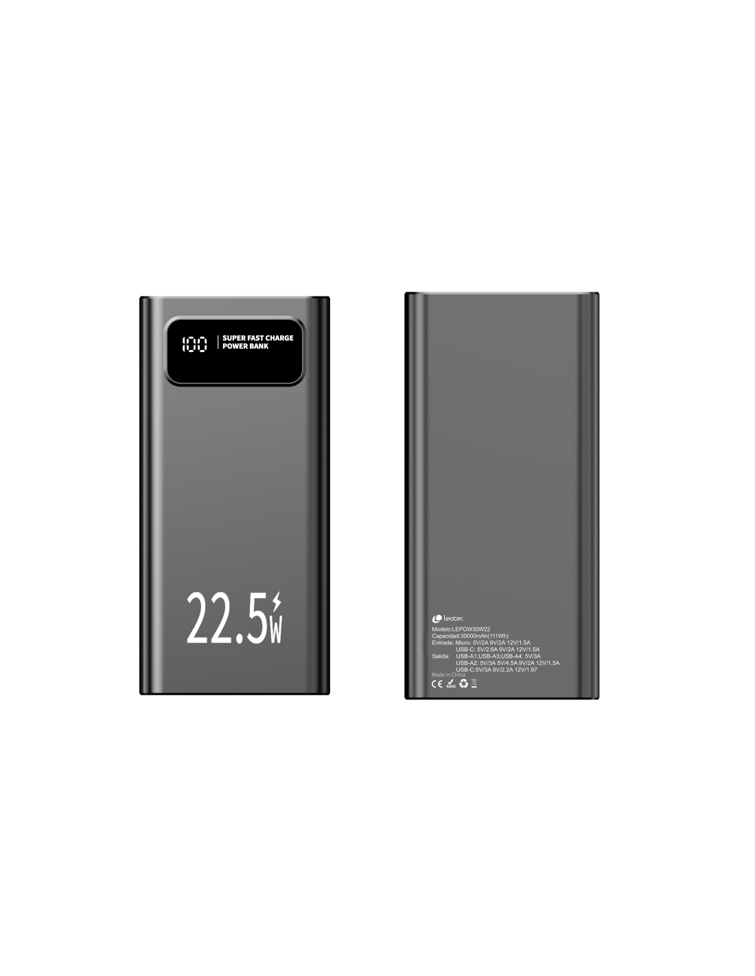 Leotec LEPOW30W22K batería externa Polímero de litio 30000 mAh Negro