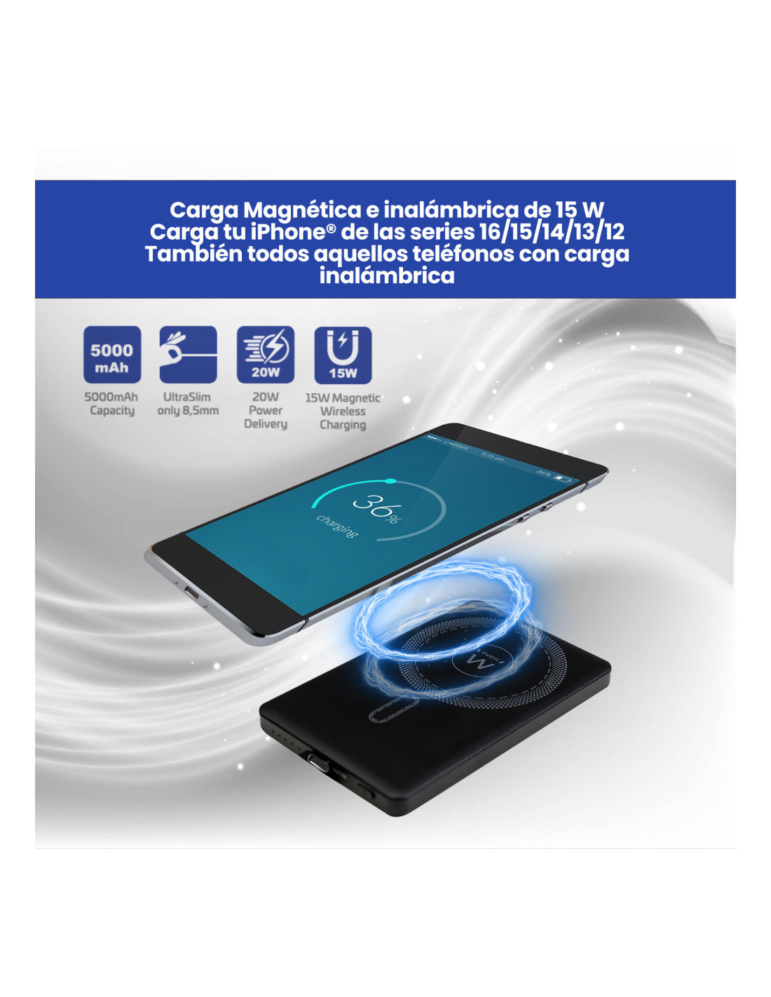 Este Power Bank UltraSlim de 5000mAh combina portabilidad, carga rápida y un diseño elegante. Gracias a su tecnología MagSafe®, se acopla magnéticamente a dispositivos compatibles, asegurando una carga eficiente y sin cables. Su potente salida PD 22.5W y Quick Charge (QC) permite una recarga rápida para smartphones, tablets y otros dispositivos electrónicos.
