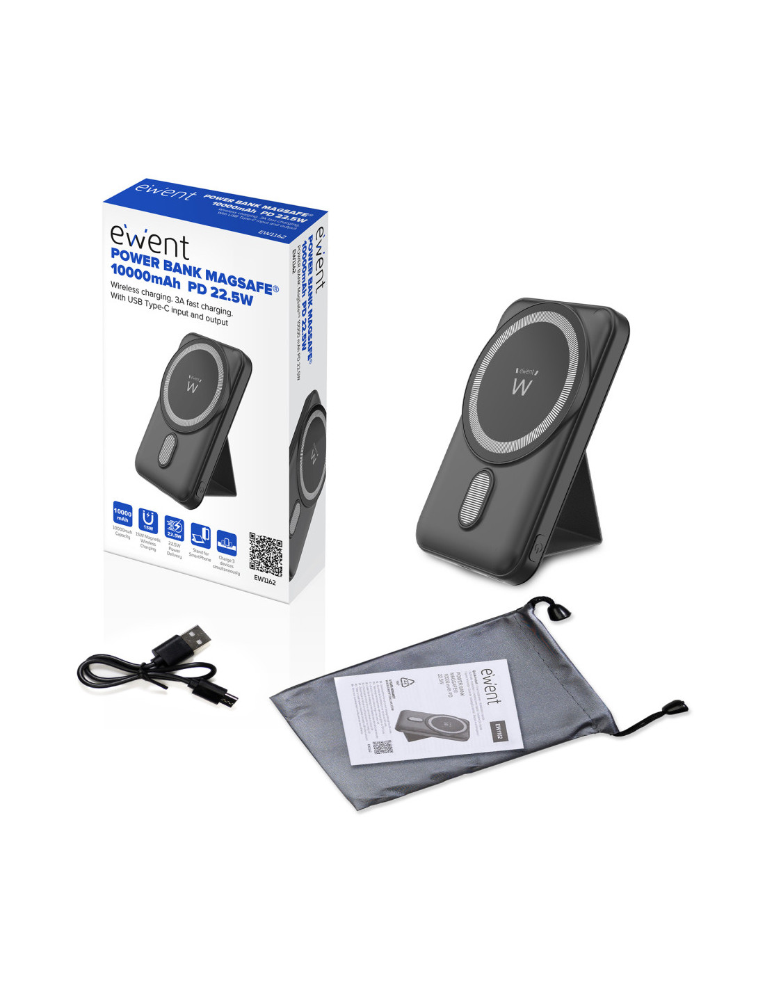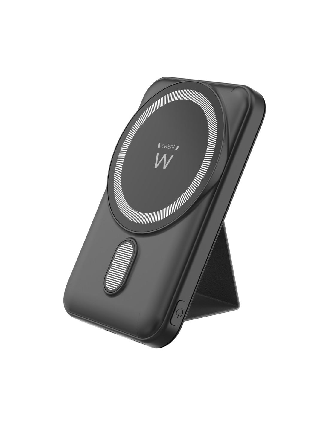 El power bank incluye un soporte plegable que te permite usar tu smartphone cómodamente mientras se carga. Su diseño compacto garantiza portabilidad, encajando fácilmente en tu bolsillo o bolso. Gracias a sus materiales de alta calidad y certificaciones, el Power Bank EWENT asegura la carga más segura para tus dispositivos.