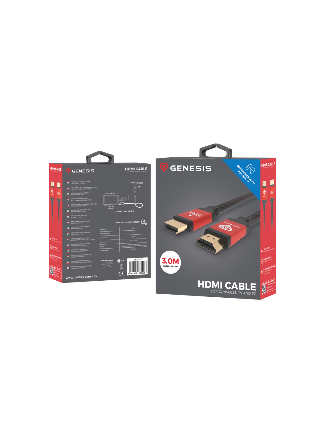 GENESIS NKA-0787. Longitud de cable: 3 m, Conector 1: HDMI tipo A (Estándar), Género del conector 1: Macho, Conector 2: HDMI tipo A (Estándar), Género del conector 2: Macho, Versión HDMI: 1.4, 3D, Color del producto: Negro, Rojo