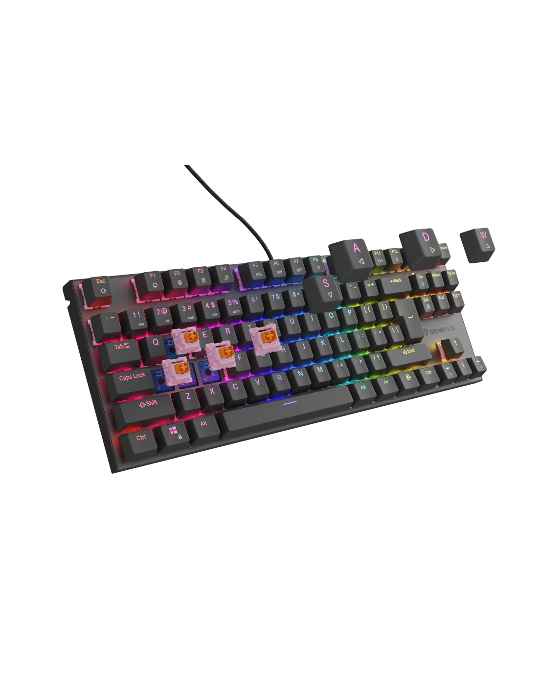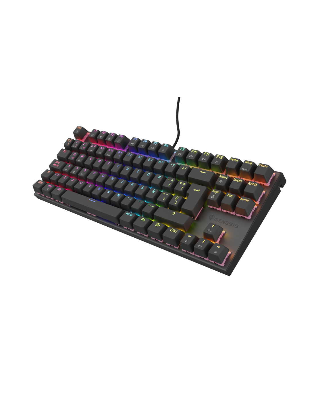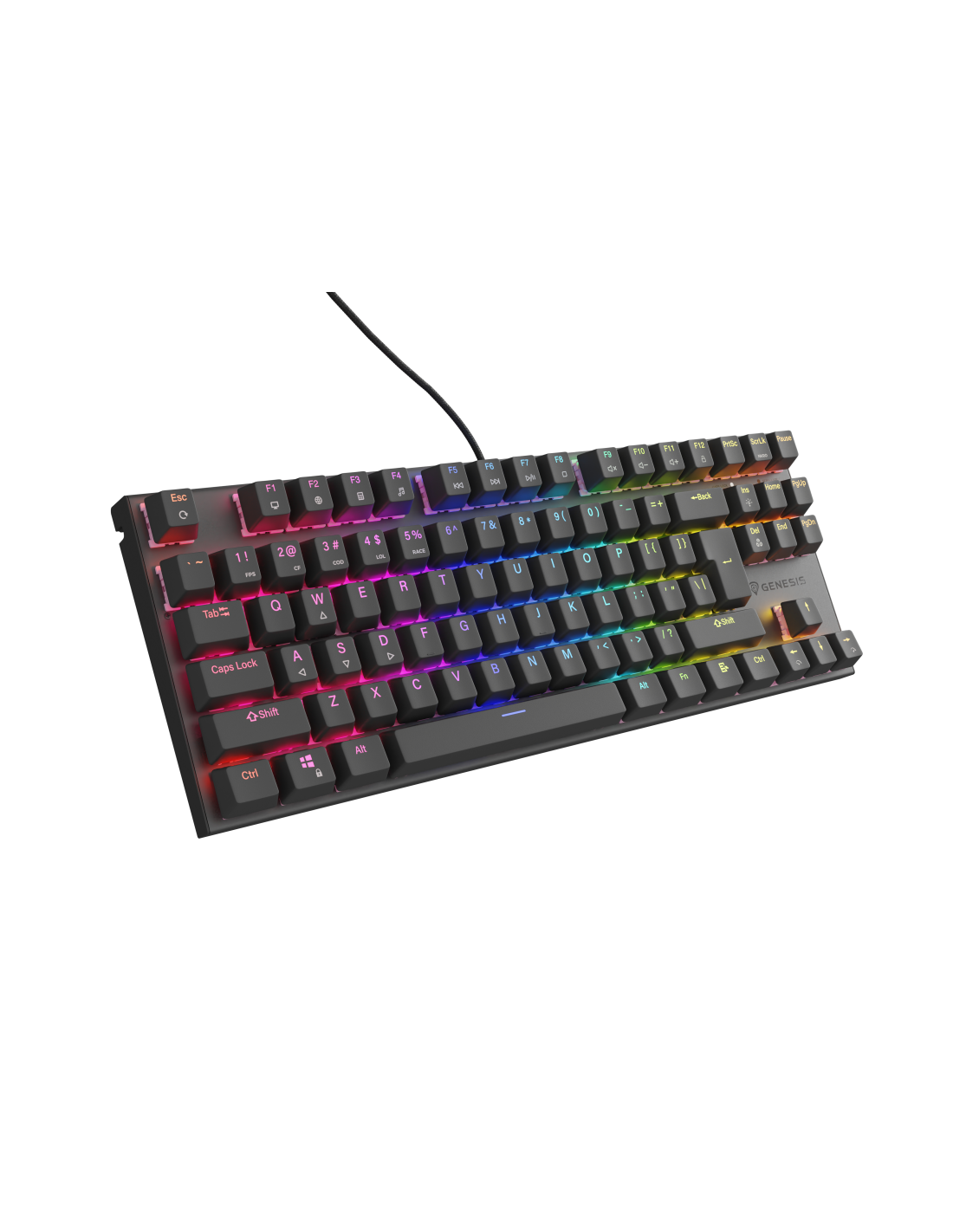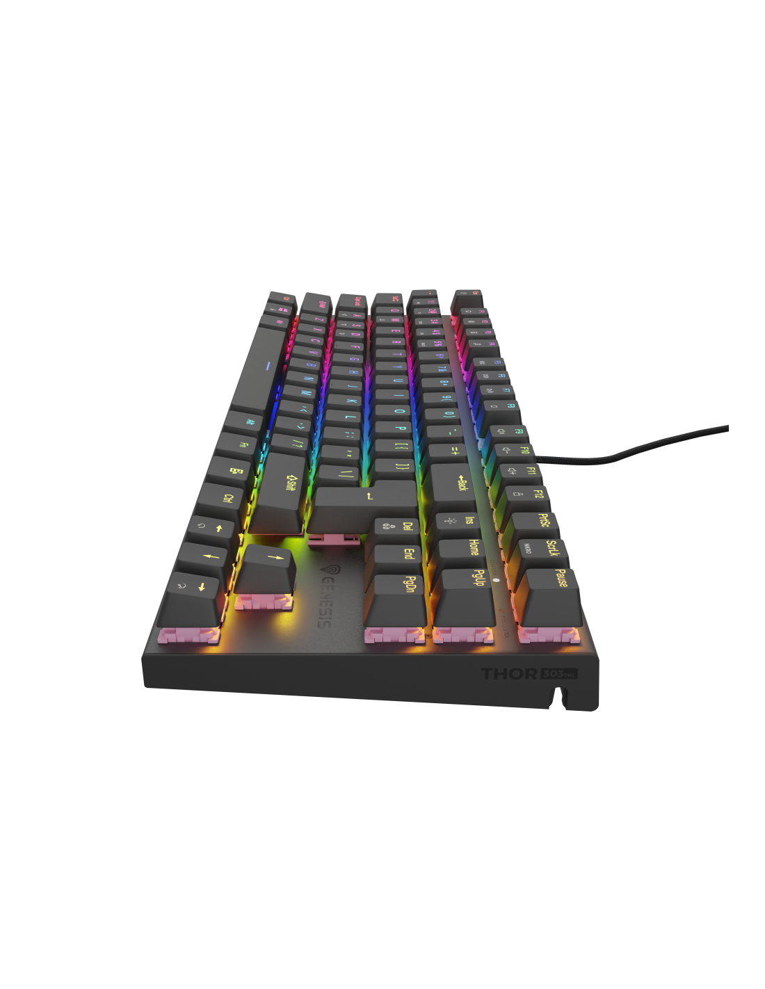 GENESIS Thor 303 TKL. Formato del teclado: Tenkeyless (sin zona numérica) (80 - 87%). Estilo de teclado: Derecho. Tecnología de conectividad: Alámbrico, Interfaz del dispositivo: USB, Interruptor del teclado: Interruptor mecánico, Diseño de teclado: QWERTY, Teclado, cantidad de teclas: 88. Tipo de retroiluminación: LED RGB. Longitud de cable: 1,8 m. Uso recomendado: Juego. Color del producto: Negro