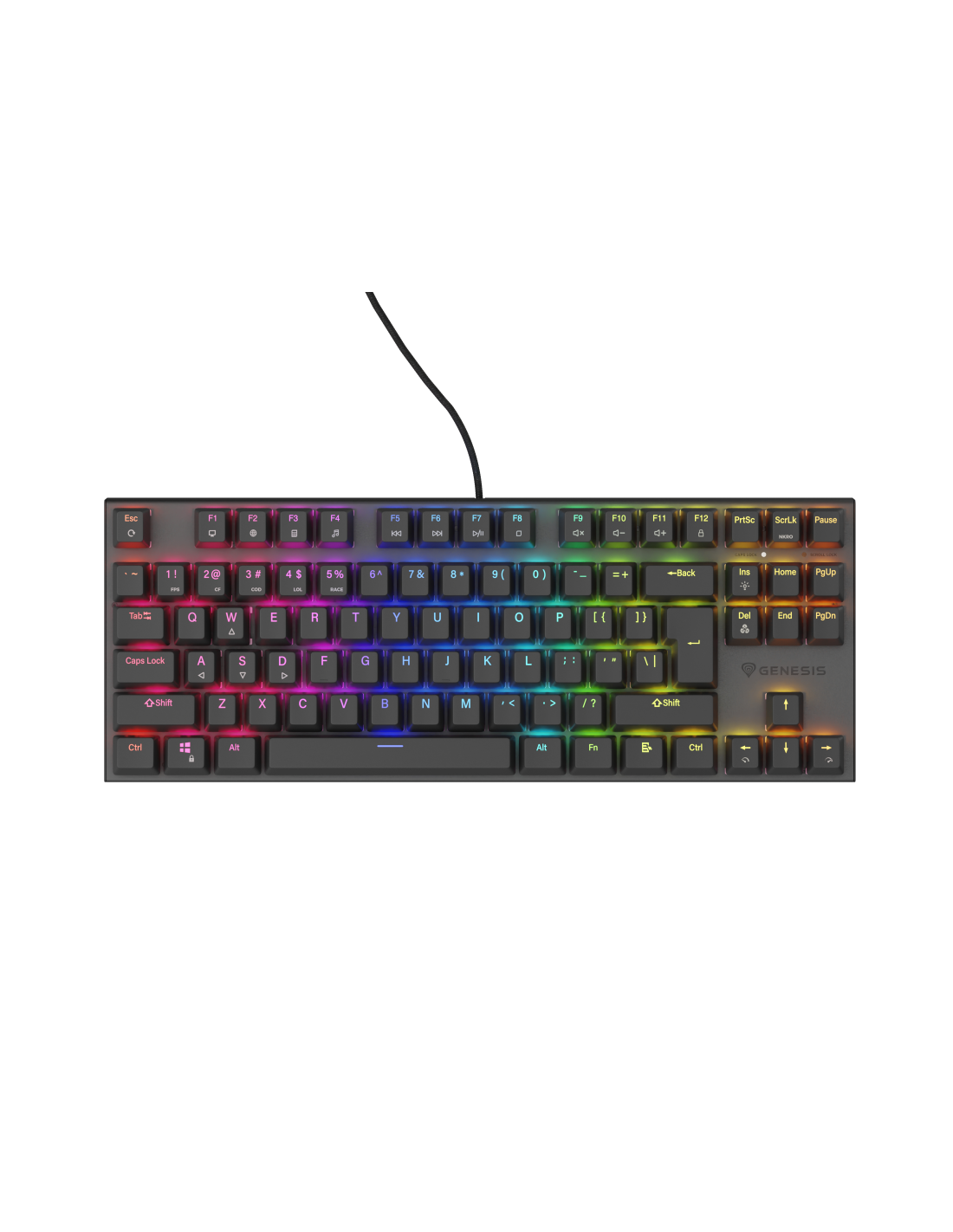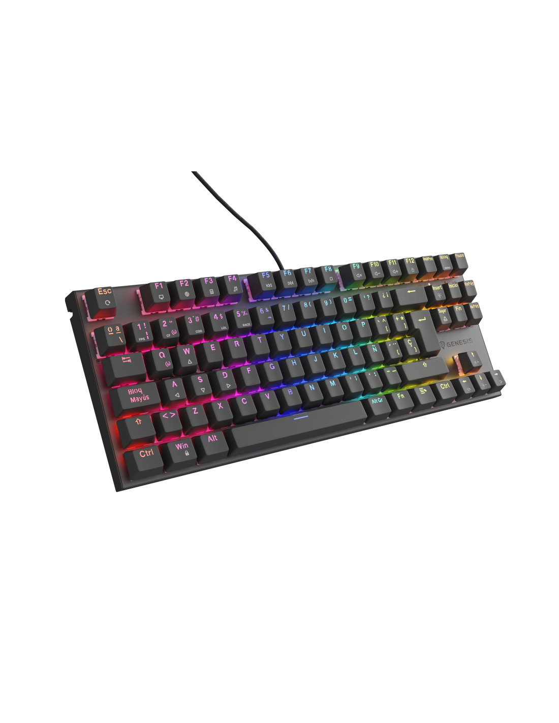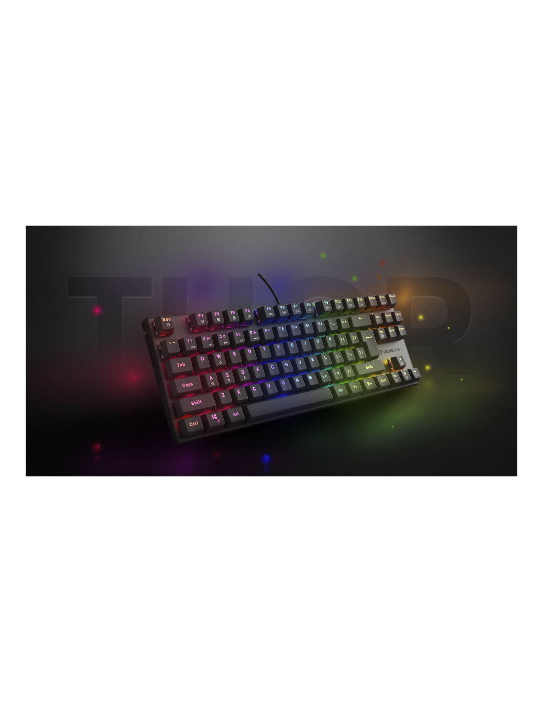 Las teclas Genesis Thor 303 TKL tienen una vida útil de hasta 50 millones de pulsaciones. El mecanismo de las teclas, combinado con la técnica de "doble inyección" y la sólida carcasa de aluminio, significa que el teclado permanecerá intacto durante años. También puede contar con muchas funciones adicionales, como N-Key Rollover (Anti - Ghosting completo), la posibilidad de bloquear las teclas de Windows e incluso efectos avanzados de iluminación RGB Prismo Effect.