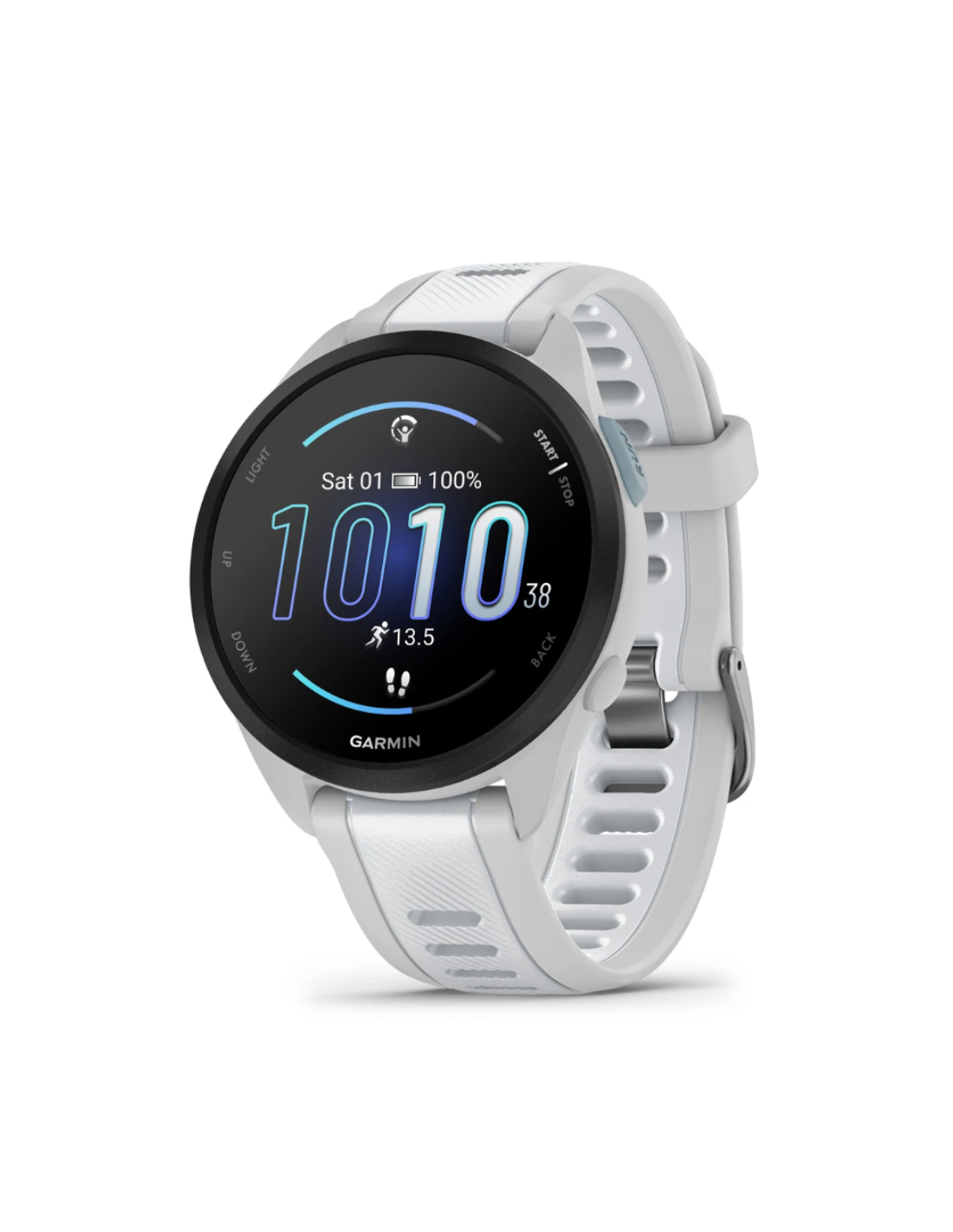 Garmin Forerunner 165. Diagonal de la pantalla: 3,05 cm (1.2"), Tecnología de visualización: AMOLED, Resolución de la pantalla: 390 x 390 Pixeles, Pantalla táctil. Memoria flash: 4 GB. GPS (satélite). Peso: 39 g. Material de la banda: Silicona, Color de banda: Blanco