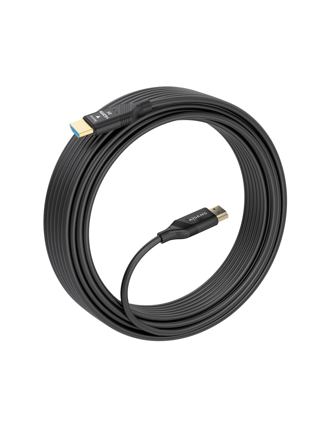 - Fabricado con una mezcla de alambre de fibra óptica y cobre, este cable activo es menos sensible a interferencias EMI, lo cual ofrece una señal clara y fiable de audio/vídeo, incluso en entornos como centros de datos, hospitales, etc.
