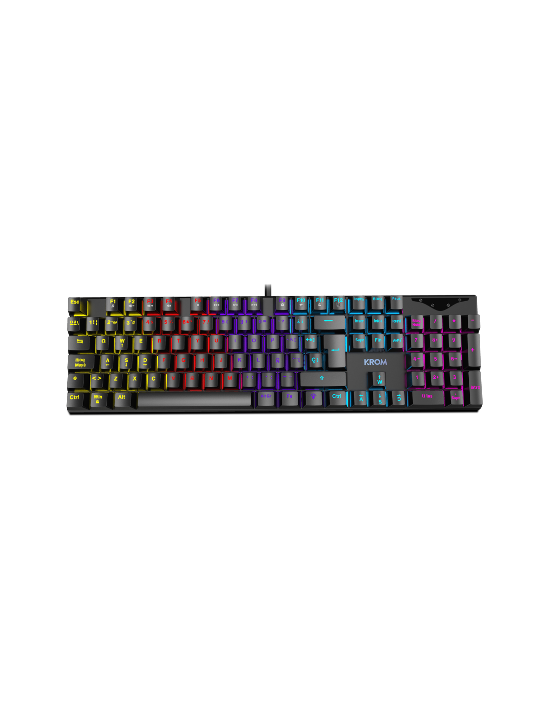 Krom Kasic. Formato del teclado: Completo (100%). Estilo de teclado: Derecho. Tecnología de conectividad: Alámbrico, Interfaz del dispositivo: USB, Interruptor del teclado: Interruptor mecánico, Diseño de teclado: QWERTY, Teclado, cantidad de teclas: 105. Tipo de retroiluminación: LED RGB. Longitud de cable: 1,5 m. Uso recomendado: Juego. Color del producto: Negro